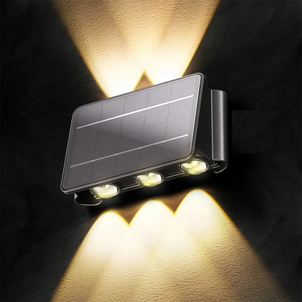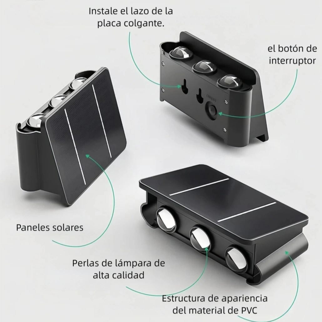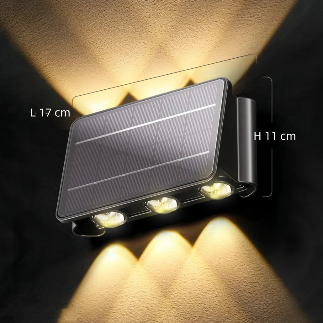 El aplique de pared exterior solar destaca por su diseño moderno y funcional, ideal para iluminar espacios exteriores con estilo. Este aplique LED exterior bidireccional ofrece una elegante iluminación doble que realza paredes y fachadas, además de contar con certificación CE y protección IP65 resistente al agua, perfecto para uso en exteriores durante todo el año.