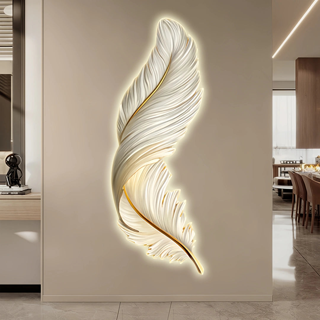 El aplique de pared moderno con diseño de pluma vertical es ideal para quienes buscan apliques de pared modernos led con estilo y eficiencia. Incorpora una tira LED oculta de alta calidad que ofrece una iluminación suave, uniforme y sin deslumbramientos, con excelente disipación del calor y larga vida útil. Fabricado en metal resistente, cuenta con corte láser de precisión y placa trasera engrosada y ecológica que aporta mayor estabilidad. Sus ganchos de aleación premium y herrajes de calidad garantizan una fijación firme y segura. El acabado translúcido tipo cristal cerámico realza su estética elegante, perfecto como aplique de pared moderno para salón o dentro de los mejores apliques de pared para dormitorios y apliques de pared led. Certificación CE.