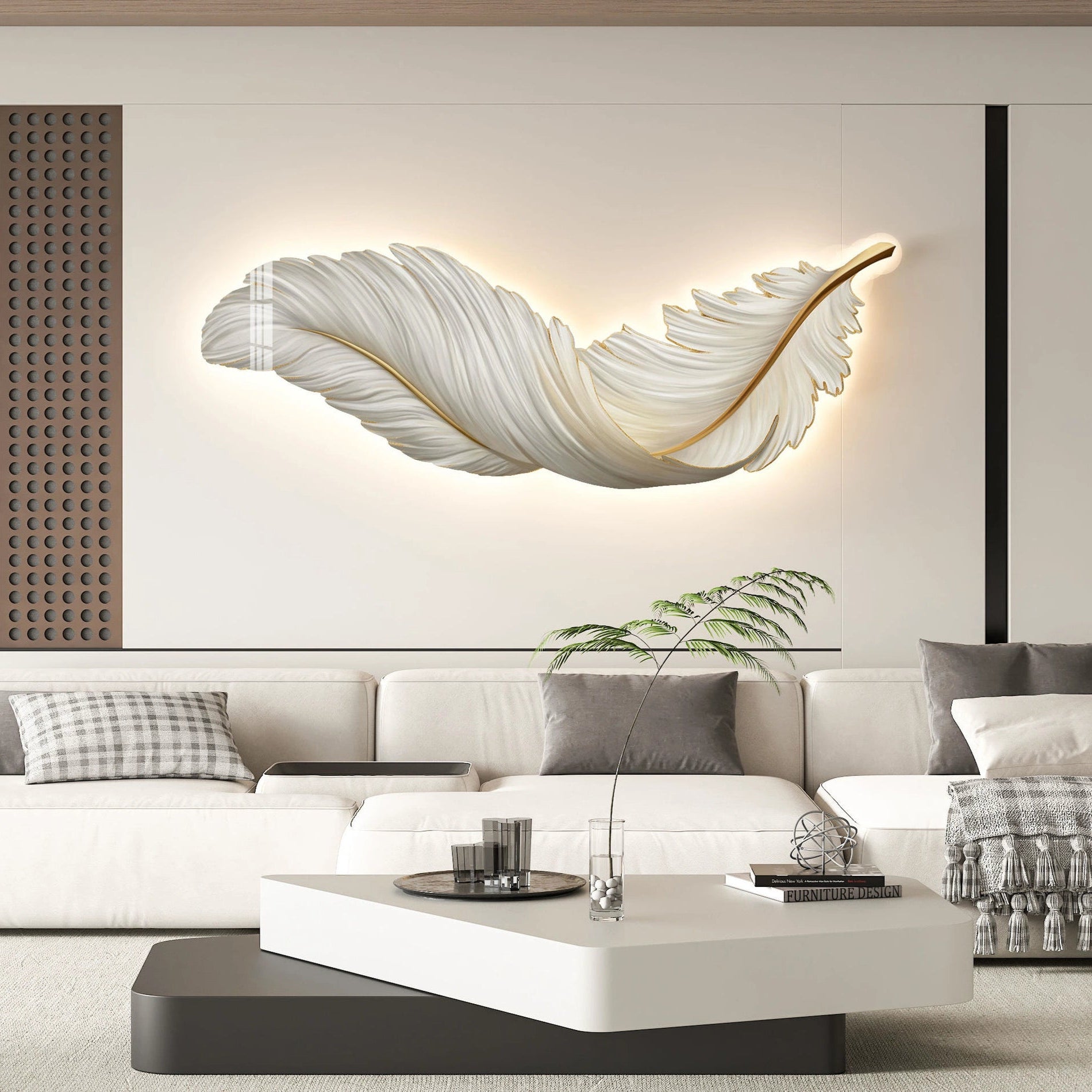 El aplique de pared moderno LED destaca por su elegante diseño en forma de pluma horizontal, aportando un toque sofisticado y contemporáneo al dormitorio o salón. Fabricado en metal de alta calidad, este aplique de pared incorpora un panel trasero ecológico y resistente, cortado con láser para un acabado perfecto y uniforme.