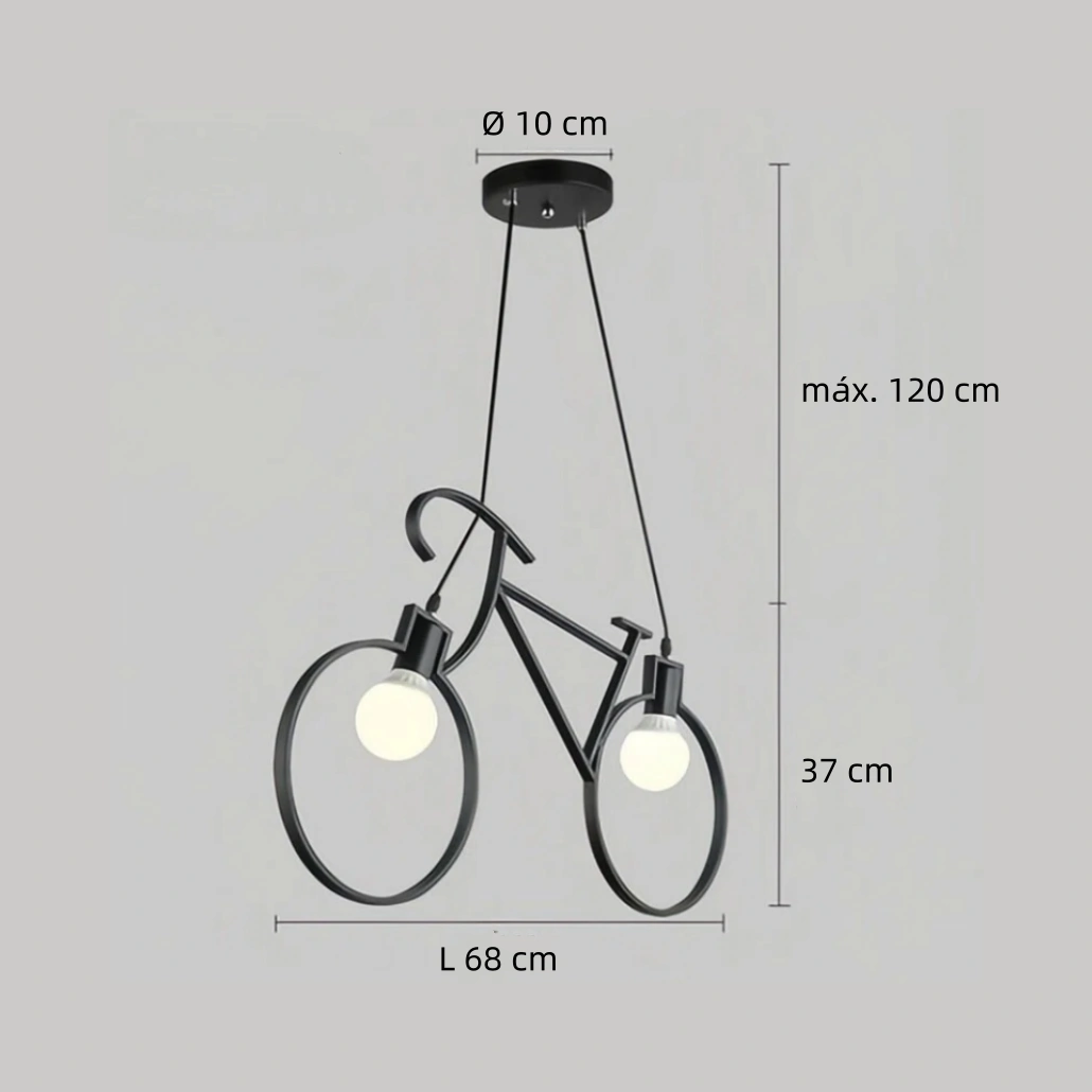 Su diseño moderno reproduce con detalle la silueta de una bicicleta, aportando un estilo creativo y distintivo. Incorpora iluminación LED con opción de luz cálida o blanca, ofreciendo un ambiente confortable y funcional para comidas y reuniones. Gracias a su sistema regulable en altura, permite ajustarse fácilmente según el techo y la disposición del comedor. Dentro de las lámparas colgantes para mesa de comedor, destaca por su durabilidad, eficiencia y estética contemporánea.