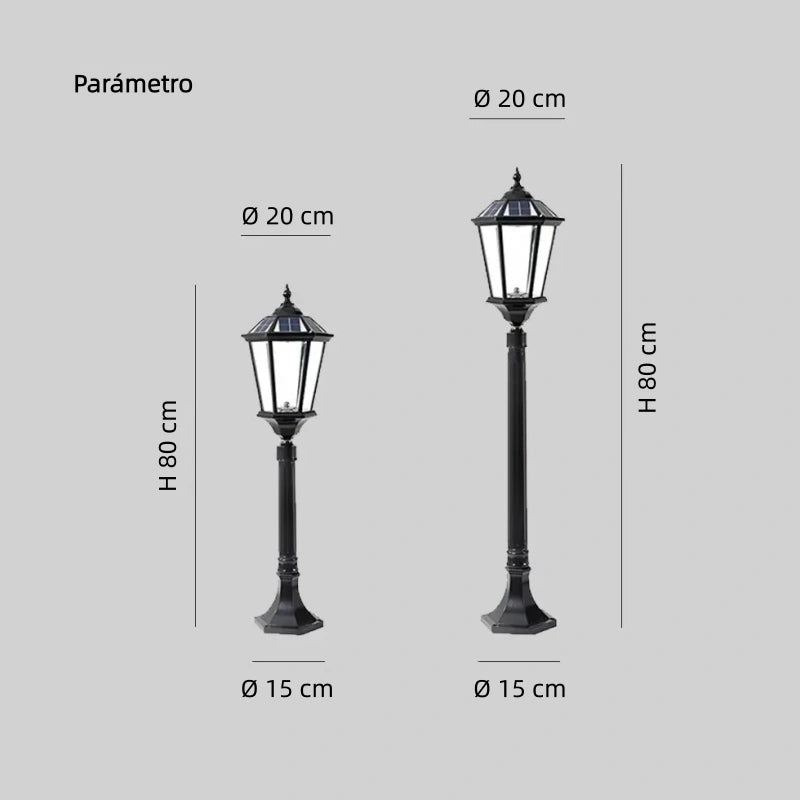 Farol de exterior solar LED diseñado como baliza de jardín, ideal para iluminar espacios exteriores como jardín y terraza. Fabricado mediante procesos de fundición a alta temperatura, corte, pulido y pintura al horno, ofrece gran resistencia y durabilidad. Su diseño clásico tipo farol emite una luz suave y acogedora. Funciona con energía solar, cuenta con protección IP65 y certificación CE.