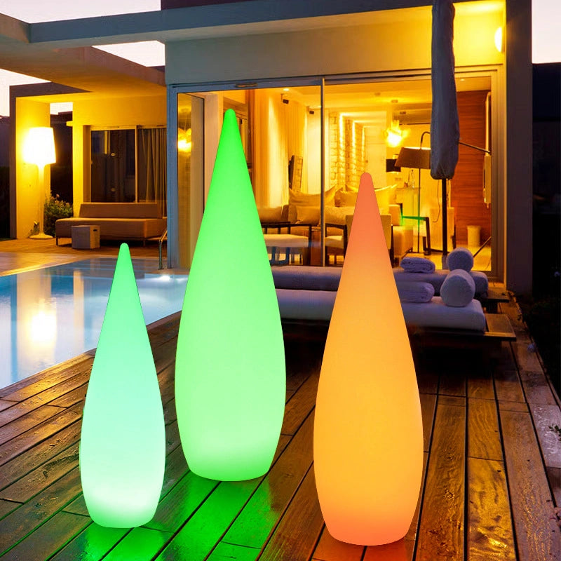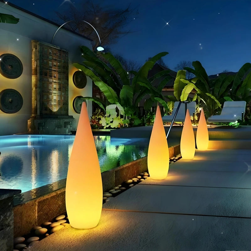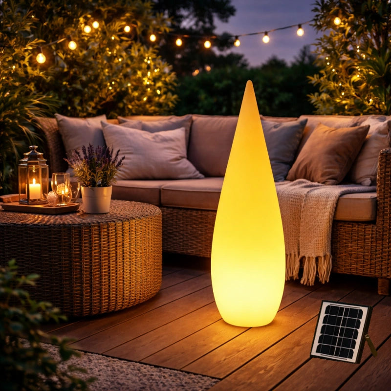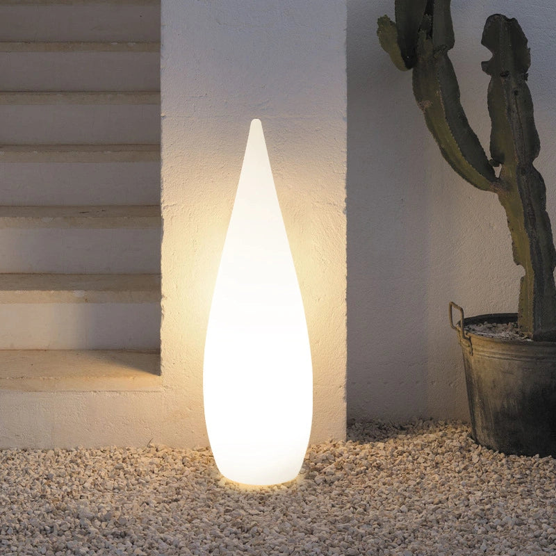 Lámpara De Pie Exterior Jardín Solar Regulable IP65 Blanco Moderno Forma Lágrima es una de las lámparas de pie exterior jardín ideales para iluminar jardín, terraza y zonas al aire libre con estilo moderno. Incorpora LED de alta eficiencia y control remoto para ajustar intensidad y elegir entre 16 colores, creando ambientes personalizados. Su cuerpo en forma de lágrima está fabricado en polietileno de alta calidad, sin impurezas, alta transmisión de luz y sin formaldehído, resistente a golpes, polvo y agua con protección IP65. Ofrece 8 a 12 horas de autonomía y cuenta con certificación CE. Disponible en versiones recargable, con cable y solar.