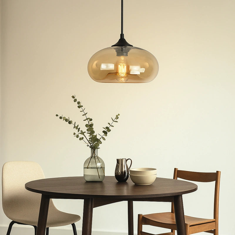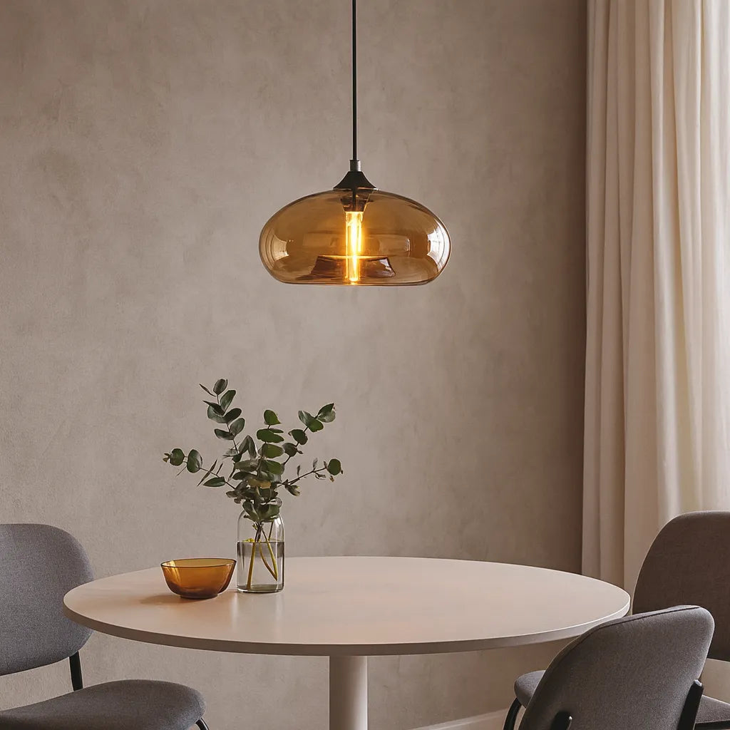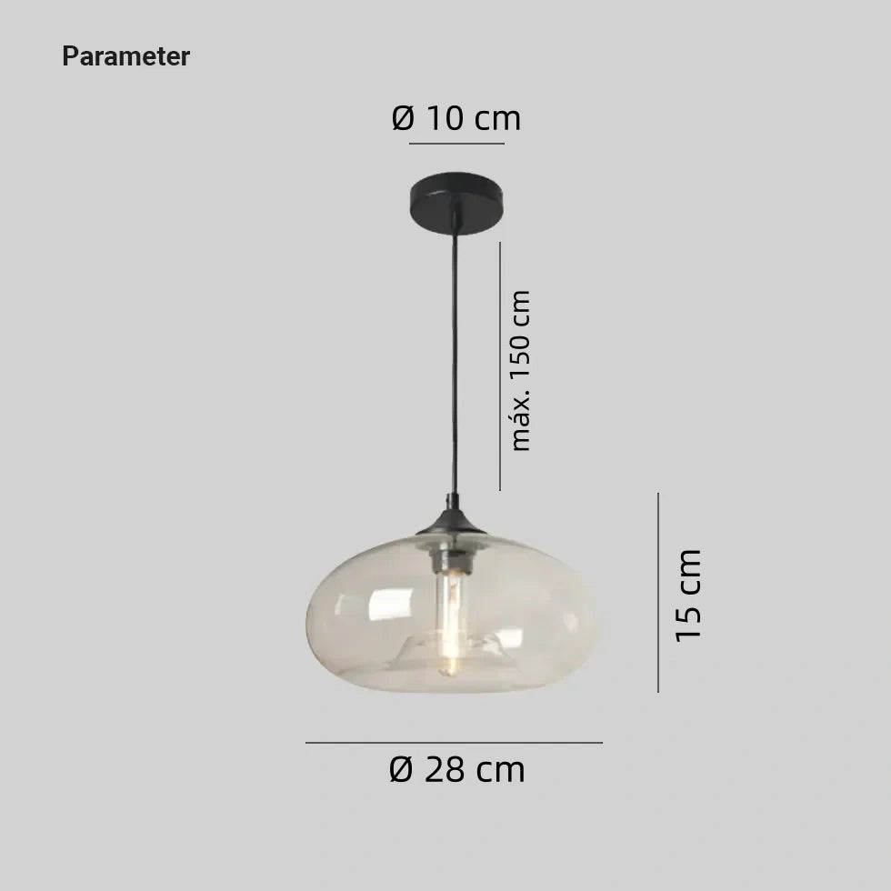 Disponible en tonos ámbar, azul, rosa, transparente, marrón y gris, su diseño versátil se adapta fácilmente a diferentes estilos decorativos. Gracias a su cable regulable en altura, esta lámpara colgante redonda permite una instalación flexible según las necesidades del espacio.