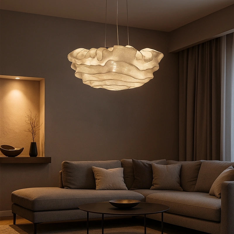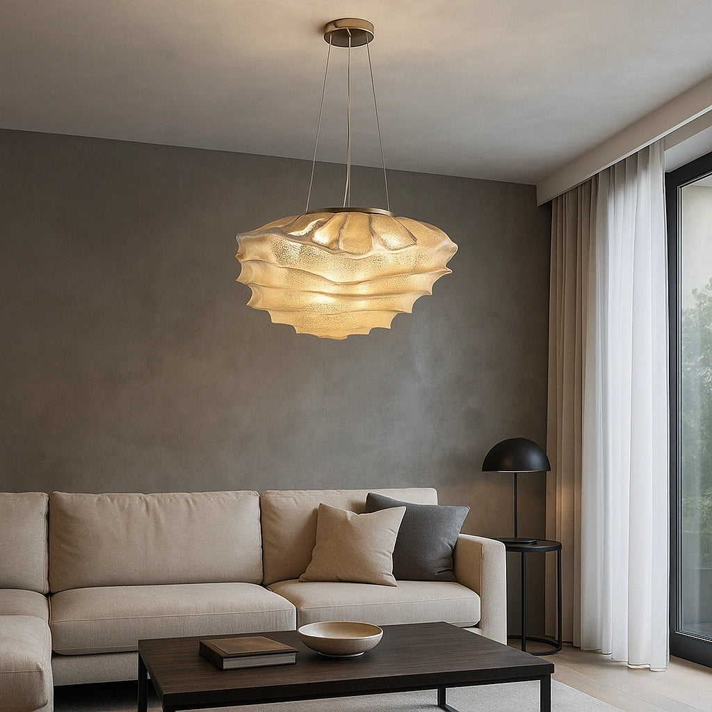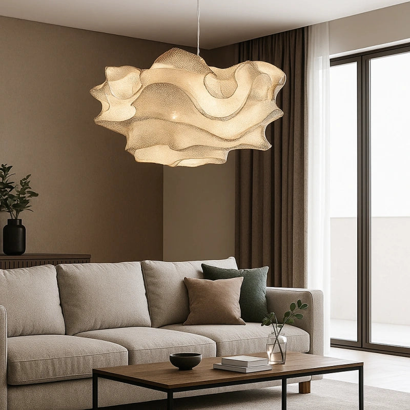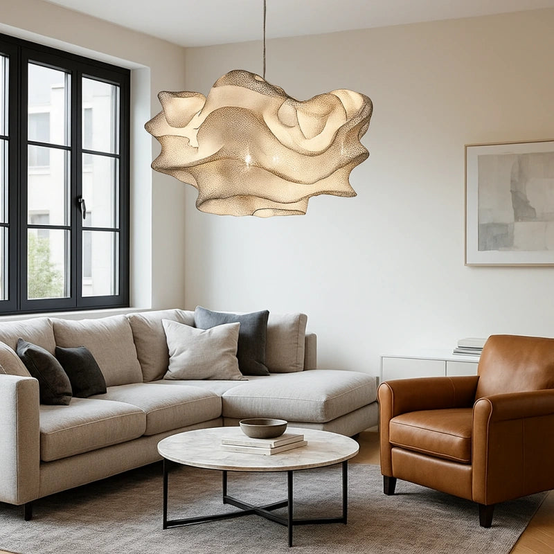 Esta lámpara colgante de diseño floral moderno en metal para salón presenta una elegante forma floral que aporta un toque suave y contemporáneo al salón. Su pantalla está hecha de malla de acero inoxidable, creando una delicada interacción entre la malla y la luz, que genera un efecto cálido y onírico. La forma ondulada del cuerpo de la lámpara no solo le da la apariencia de un tejido suave flotando en el aire, sino que también proporciona una sensación única de profundidad y dinamismo al espacio. Su diseño no solo es estéticamente atractivo, sino que también ofrece propiedades de resistencia al fuego, la corrosión y el óxido, asegurando una larga durabilidad.