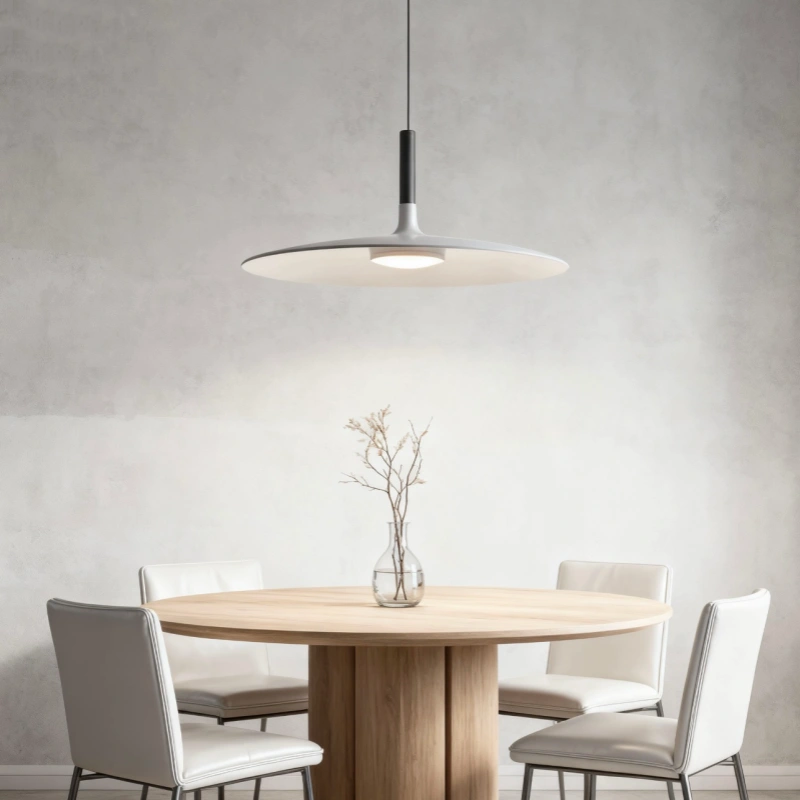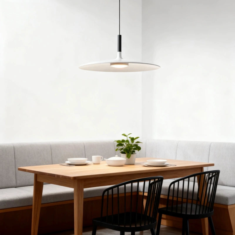 Esta Lámpara Colgante Nórdica Diseño UFO para Comedor presenta un diseño único inspirado en un platillo volante, combinando materiales de alta calidad como aluminio y hierro forjado, integrándose perfectamente en el estilo moderno nórdico. El sombreado de aluminio, tratado con varias capas de pintura, es resistente al óxido, y su estructura robusta garantiza durabilidad. Su diseño distintivo aporta un toque moderno y de moda a tu comedor.
