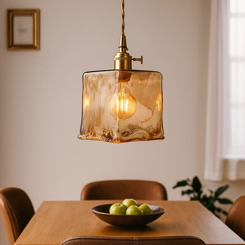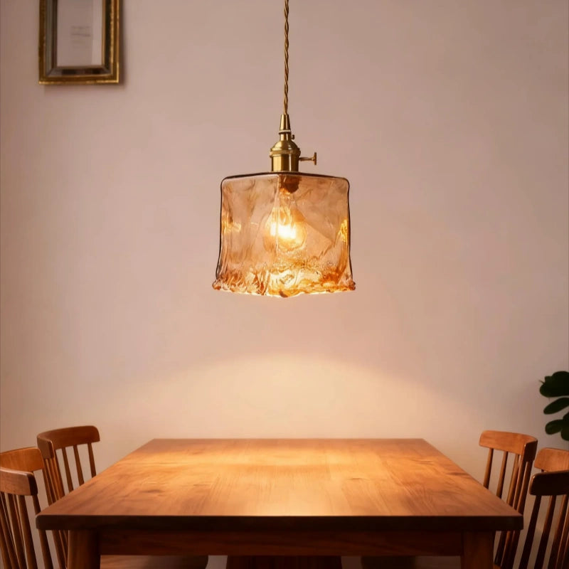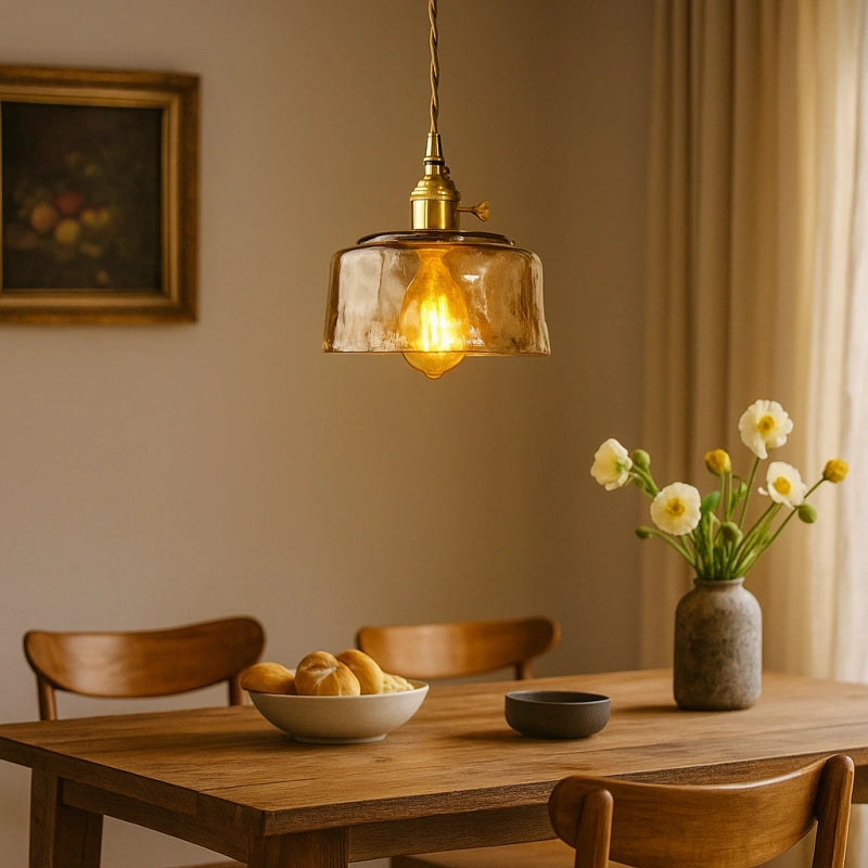 Esta lámpara colgante de vidrio ámbar estilo vintage para comedor está elaborada con una pantalla de vidrio ámbar engrosado hecha a mano y un casquillo de latón de alta calidad. El casquillo de latón es resistente al calor y presenta un brillo llamativo. La pantalla de vidrio ámbar emite una luz cálida y suave que aporta un encanto especial al espacio. El cable trenzado retro y los detalles en latón realzan el toque refinado y vintage, convirtiéndola en la elección perfecta para añadir un encanto único a tu comedor.