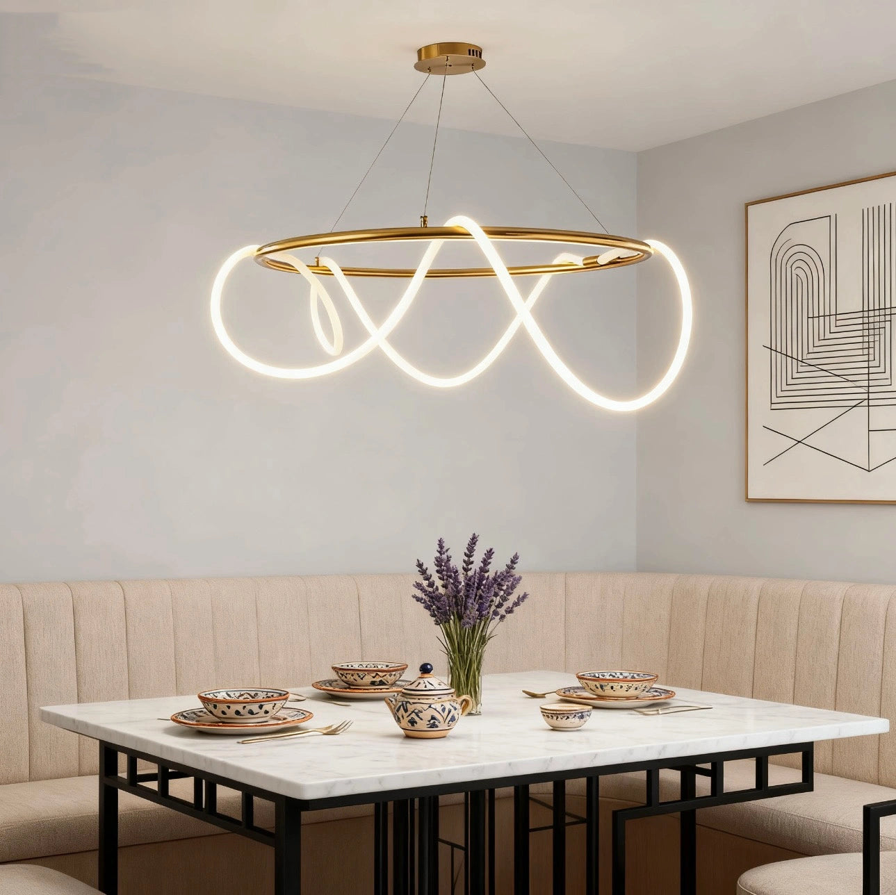 Este Lámpara Colgante LED con Diseño de Aro Creativo Minimalista para Comedor presenta una estructura de hierro con un acabado en galvanizado, elaborada mediante múltiples procesos artesanales que incluyen un pulido fino y un acabado suave. Su color es uniforme, resistente a la corrosión y no se deforma fácilmente. La tira de silicona LED de 360° proporciona una luz suave, homogénea, sin parpadeo visible y no deslumbrante, permitiendo además personalizar la forma de la lámpara con varias opciones de diseño. Es la elección perfecta tanto para decorar como para iluminar su comedor con estilo y elegancia.