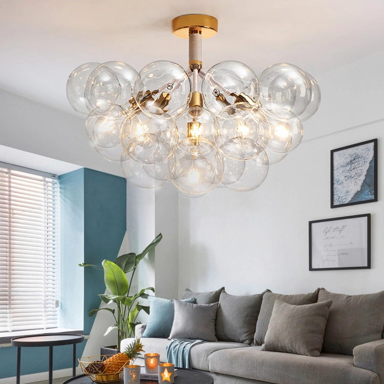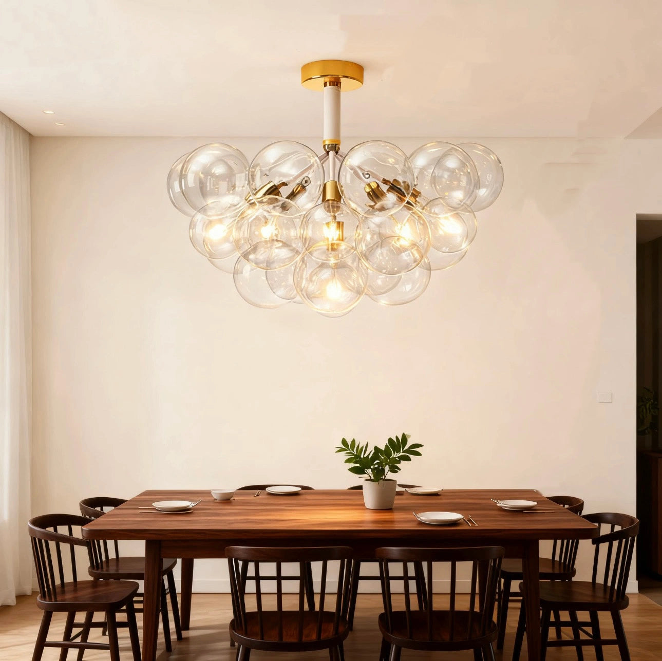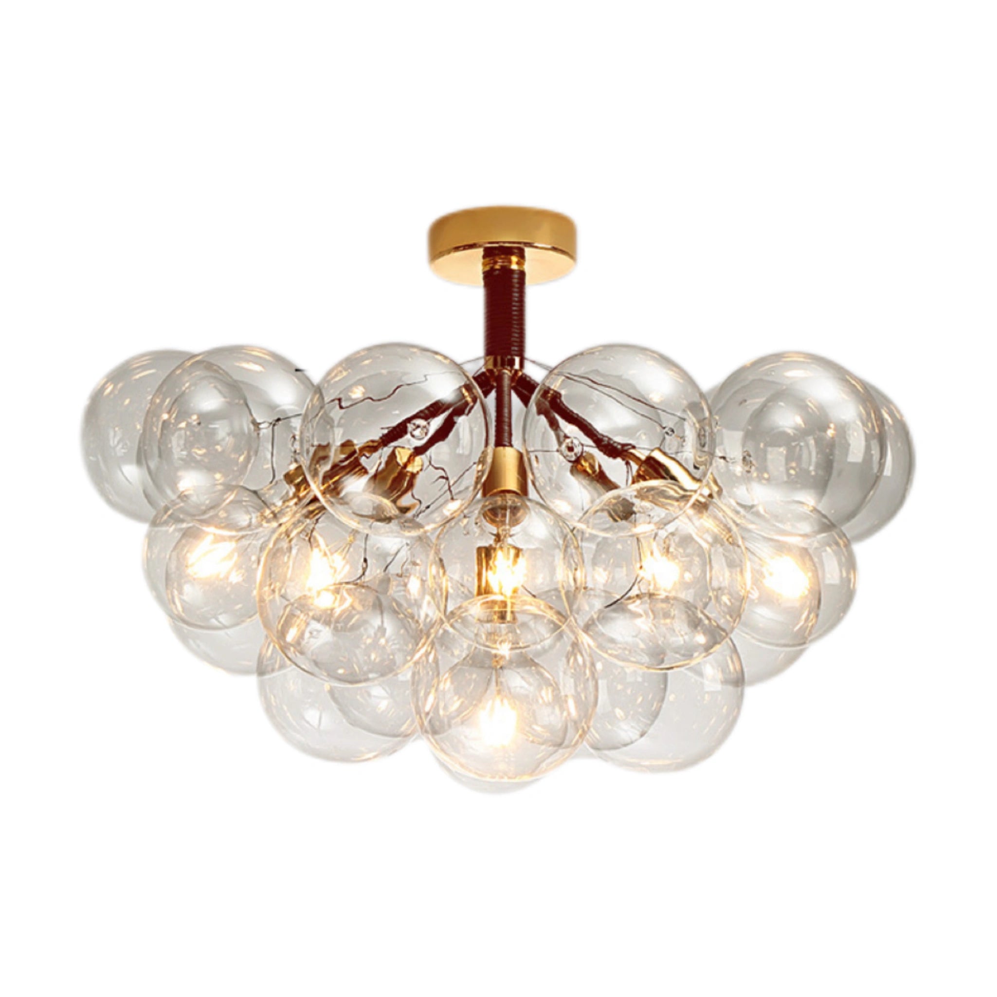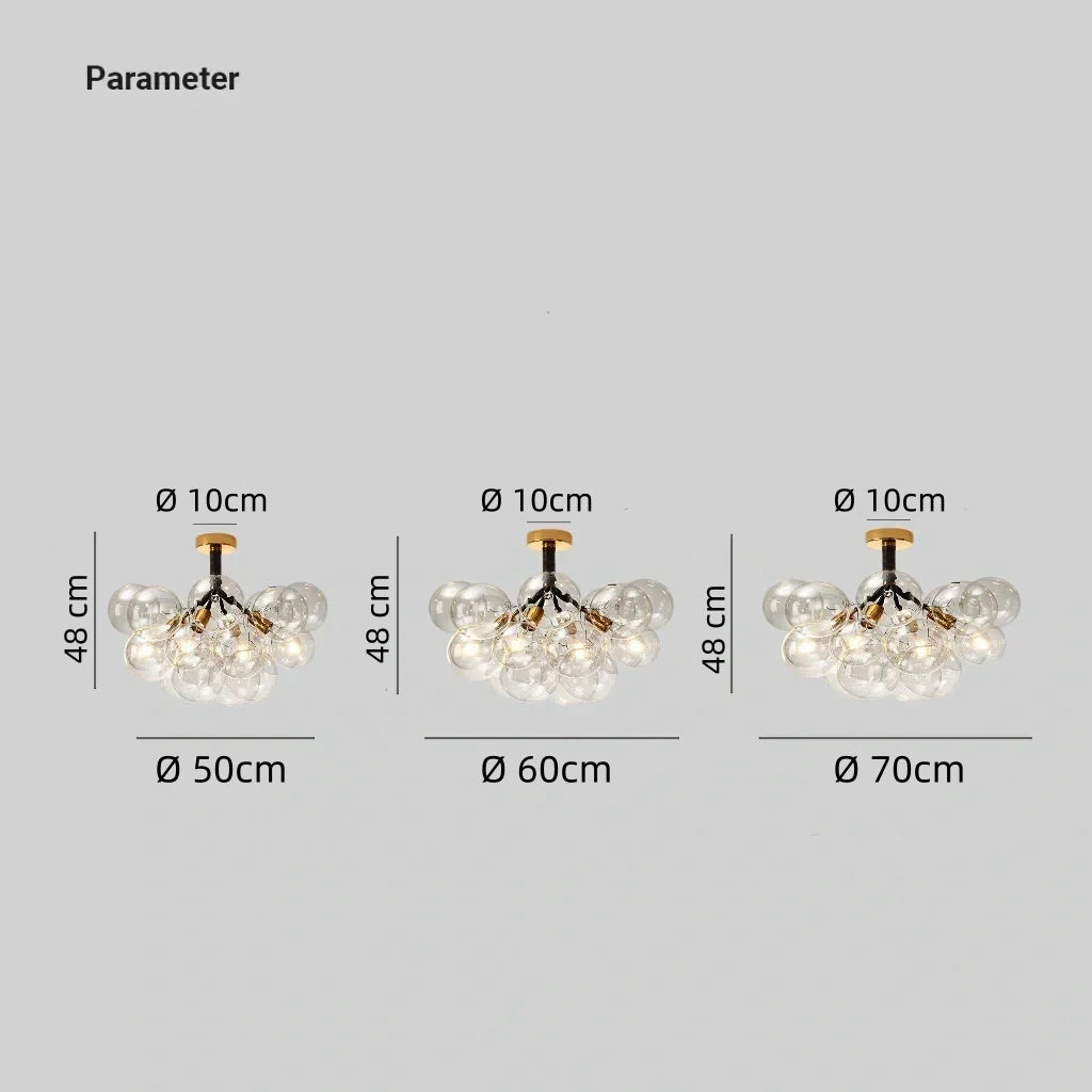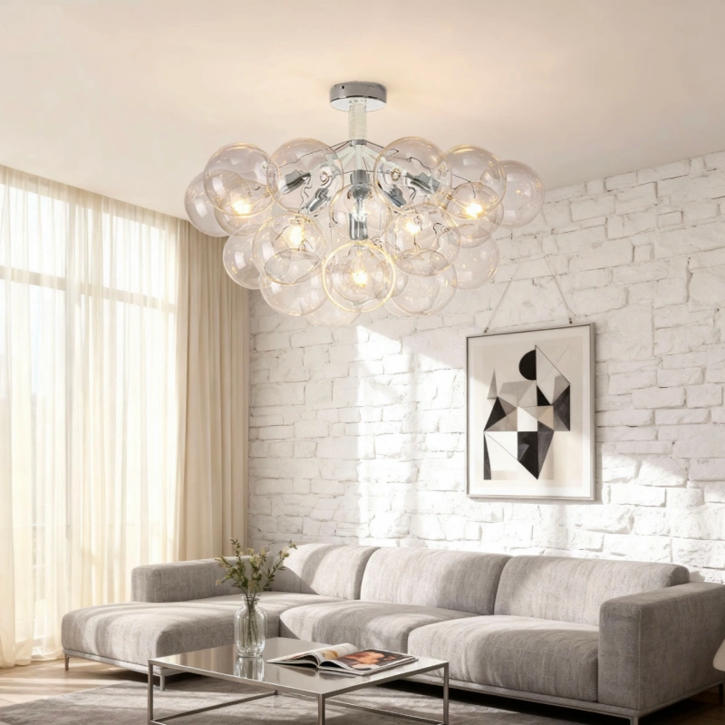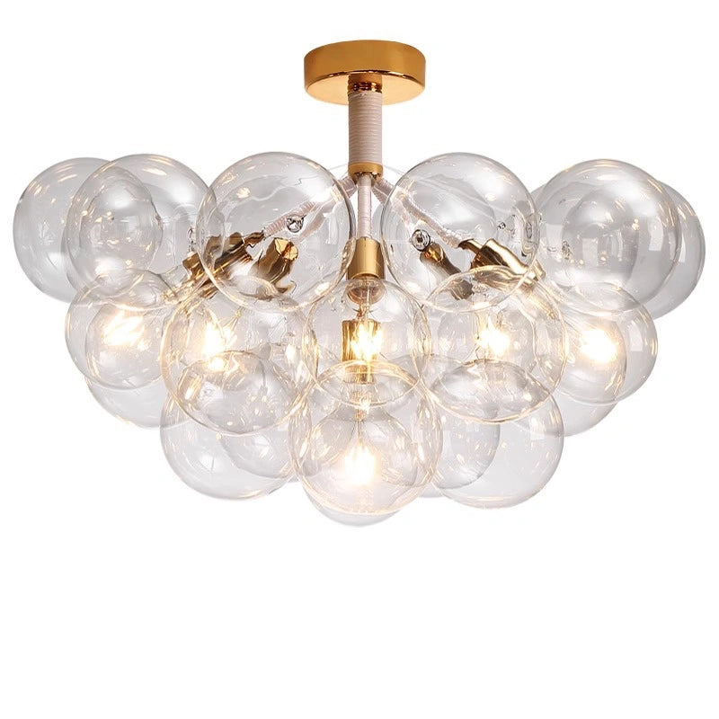 Esta lámpara de techo de vidrio con diseño de burbujas creativas está fabricada con una pantalla de vidrio soplado a mano. Con materiales de alta calidad y una meticulosa técnica de soplado artesanal, ofrece una excelente transmisión de luz, superficie lisa y uniforme, y una gran durabilidad. El cuerpo de la lámpara está compuesto por metal con acabado galvanizado, lo que garantiza un trabajo refinado, una superficie suave como la seda, y protección contra la oxidación y la corrosión, asegurando una vida útil prolongada. Utiliza un casquillo E27 estándar, compatible con bombillas LED, de bajo consumo o incandescentes. Disponibles en varios estilos, para adaptarse a sus necesidades, esta lámpara es la elección perfecta para la decoración interior.