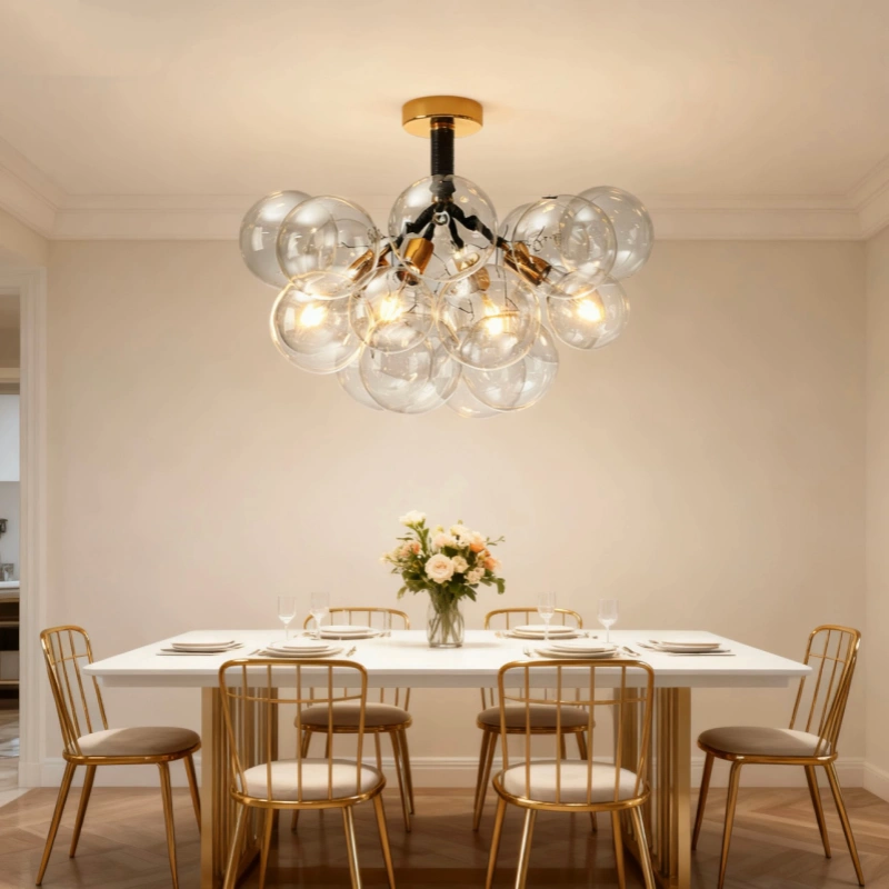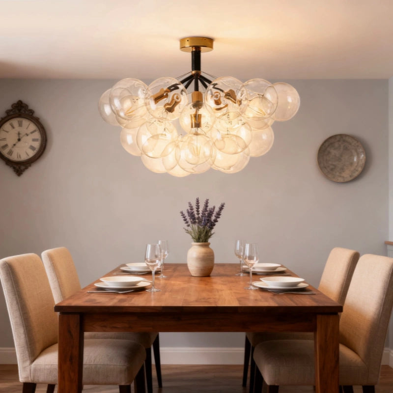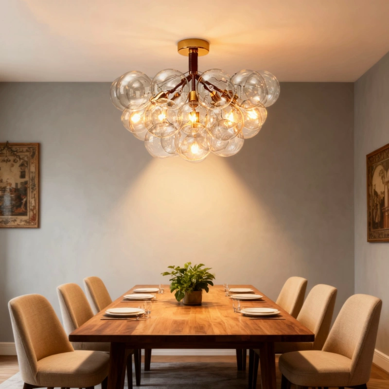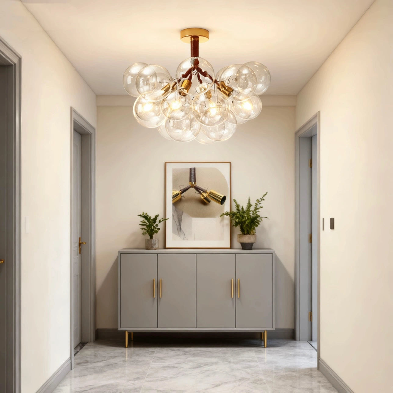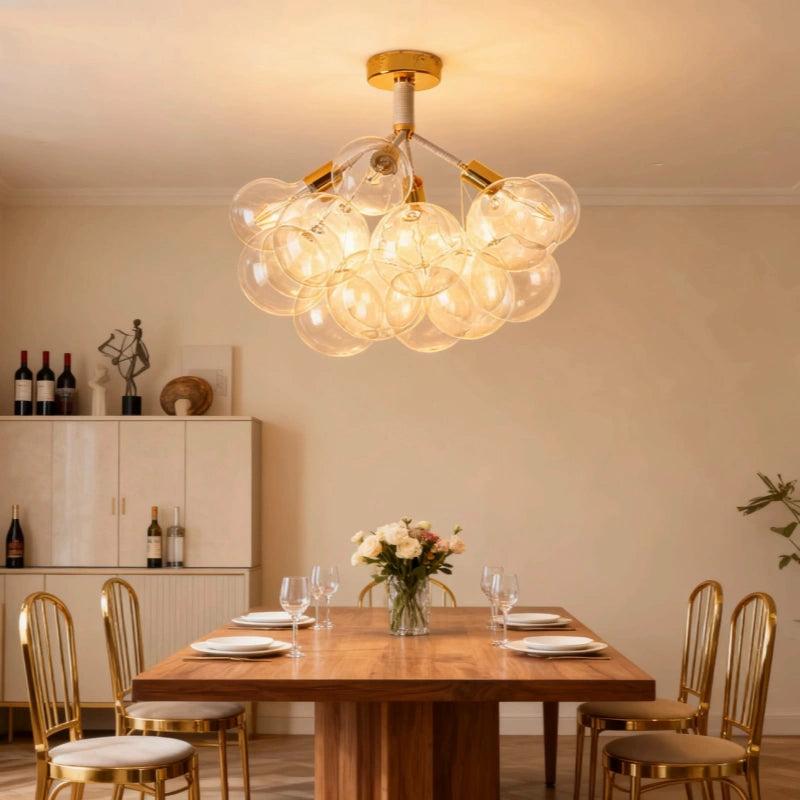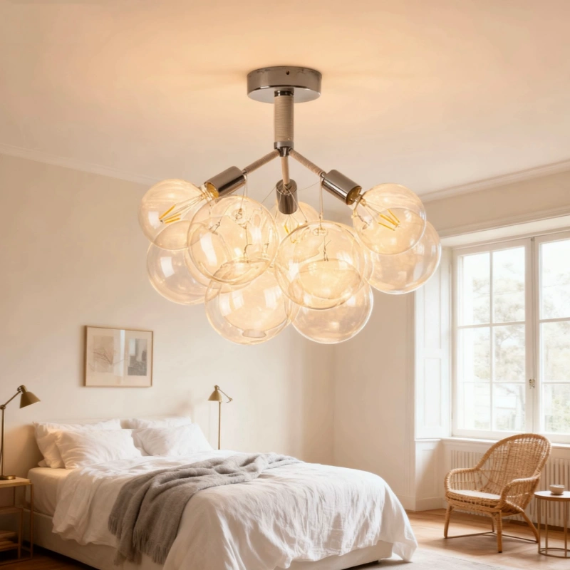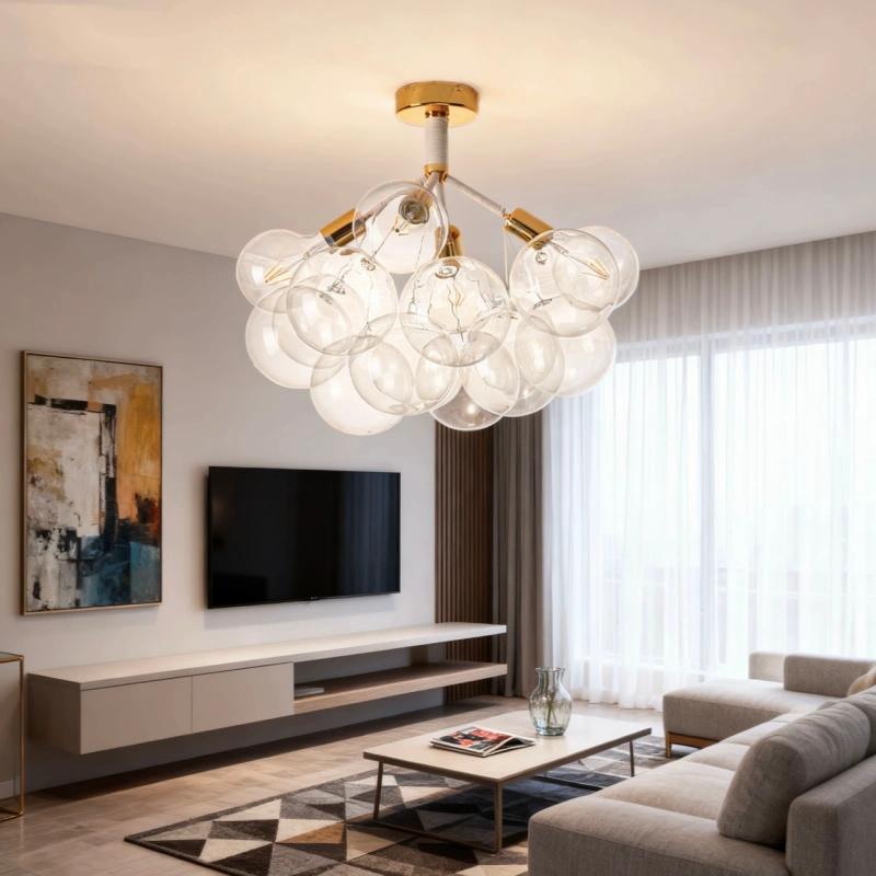Esta lámpara de techo de vidrio con diseño de burbujas creativas está fabricada con una pantalla de vidrio soplado a mano. Con materiales de alta calidad y una meticulosa técnica de soplado artesanal, ofrece una excelente transmisión de luz, superficie lisa y uniforme, y una gran durabilidad. El cuerpo de la lámpara está compuesto por metal con acabado galvanizado, lo que garantiza un trabajo refinado, una superficie suave como la seda, y protección contra la oxidación y la corrosión, asegurando una vida útil prolongada. Utiliza un casquillo E27 estándar, compatible con bombillas LED, de bajo consumo o incandescentes. Disponibles en varios estilos, para adaptarse a sus necesidades, esta lámpara es la elección perfecta para la decoración interior.