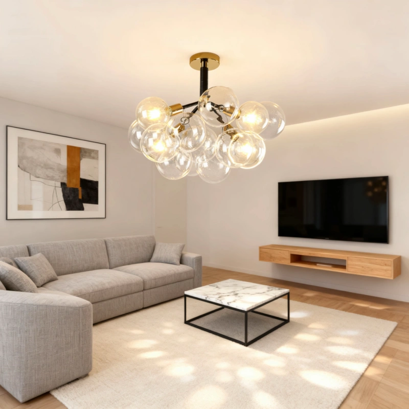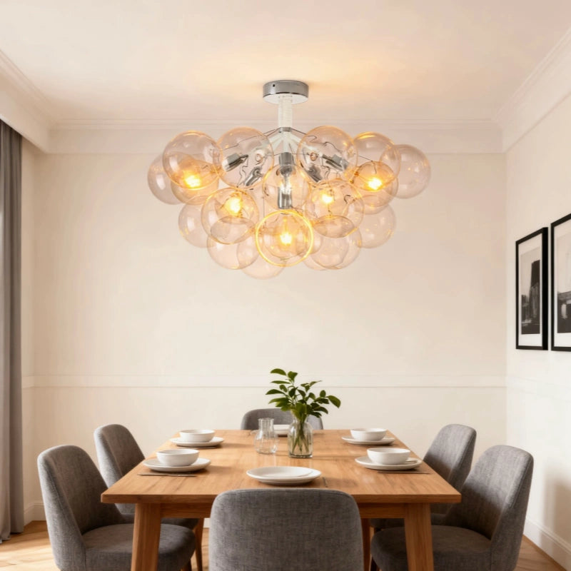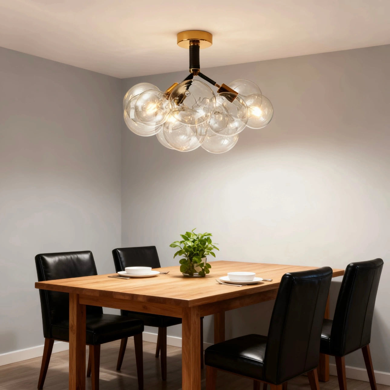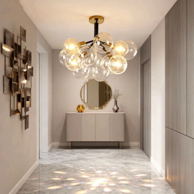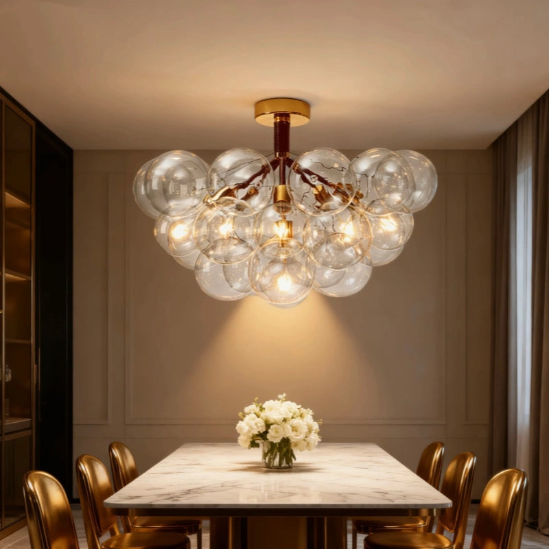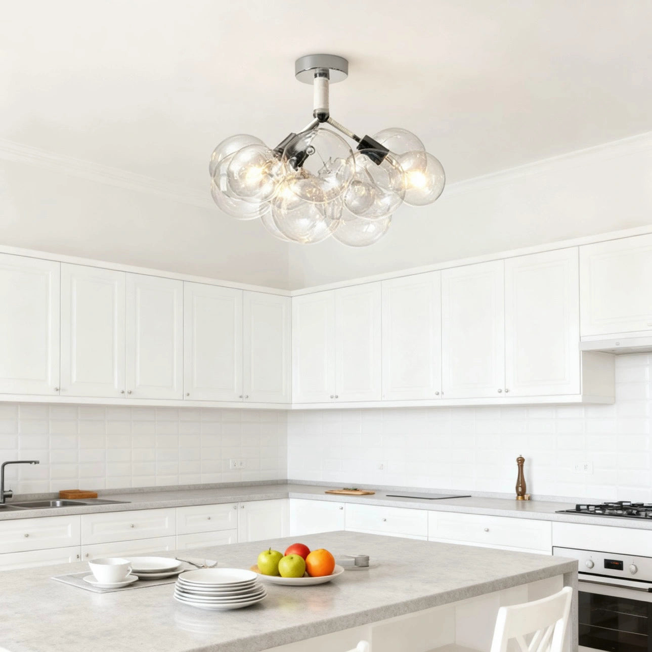 Esta lámpara de techo de vidrio con diseño de burbujas creativas está fabricada con una pantalla de vidrio soplado a mano. Con materiales de alta calidad y una meticulosa técnica de soplado artesanal, ofrece una excelente transmisión de luz, superficie lisa y uniforme, y una gran durabilidad. El cuerpo de la lámpara está compuesto por metal con acabado galvanizado, lo que garantiza un trabajo refinado, una superficie suave como la seda, y protección contra la oxidación y la corrosión, asegurando una vida útil prolongada. Utiliza un casquillo E27 estándar, compatible con bombillas LED, de bajo consumo o incandescentes. Disponibles en varios estilos, para adaptarse a sus necesidades, esta lámpara es la elección perfecta para la decoración interior.