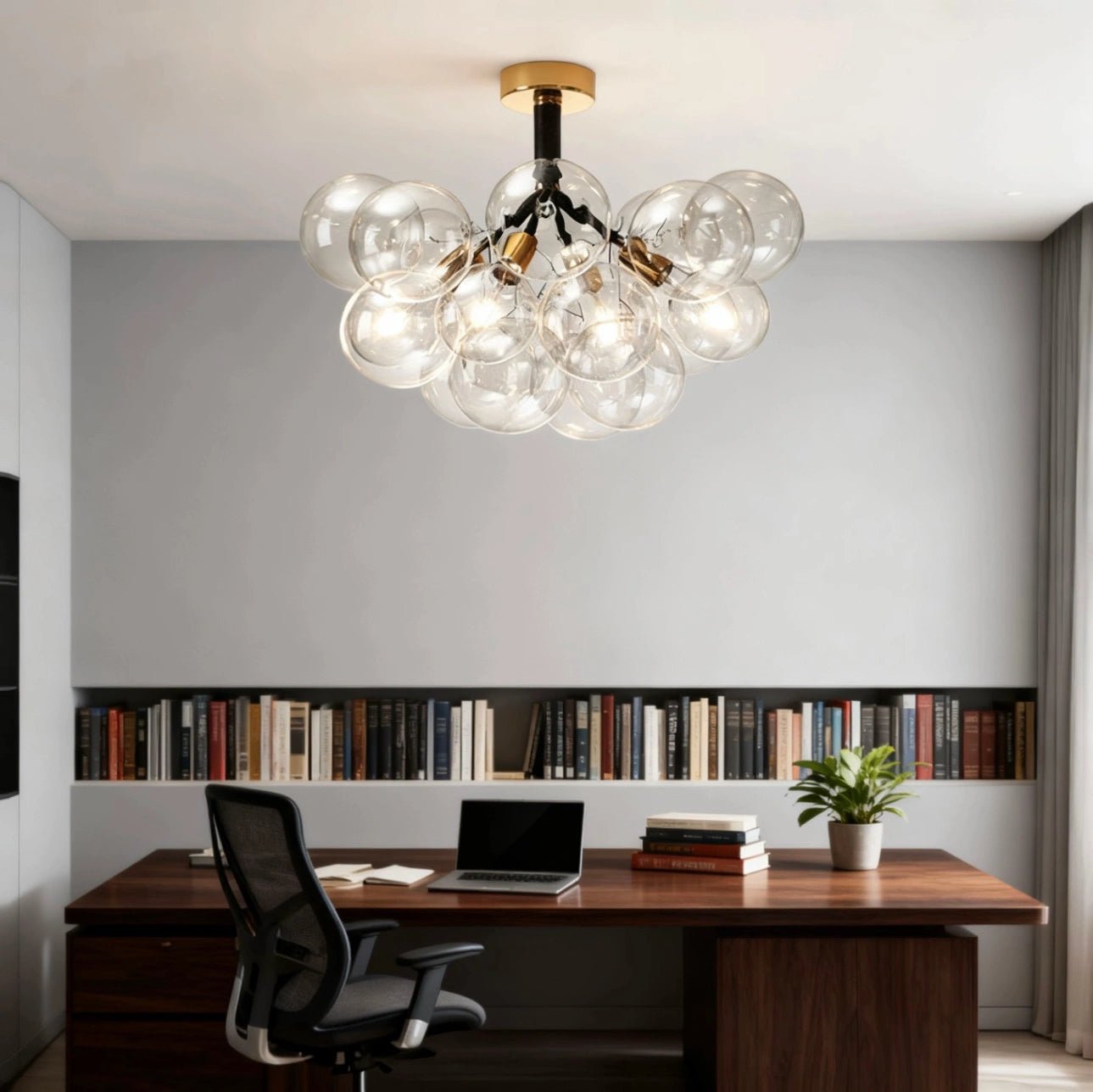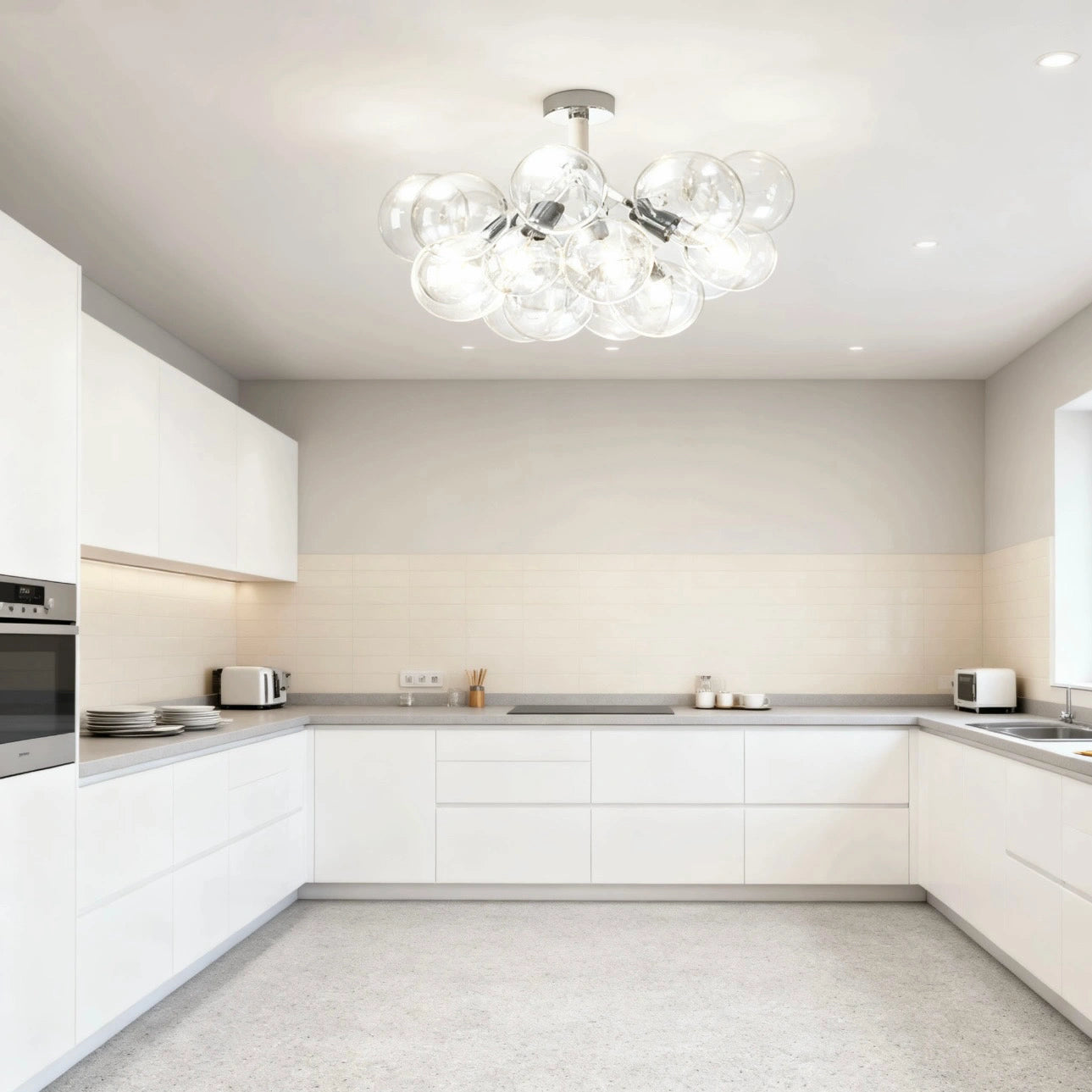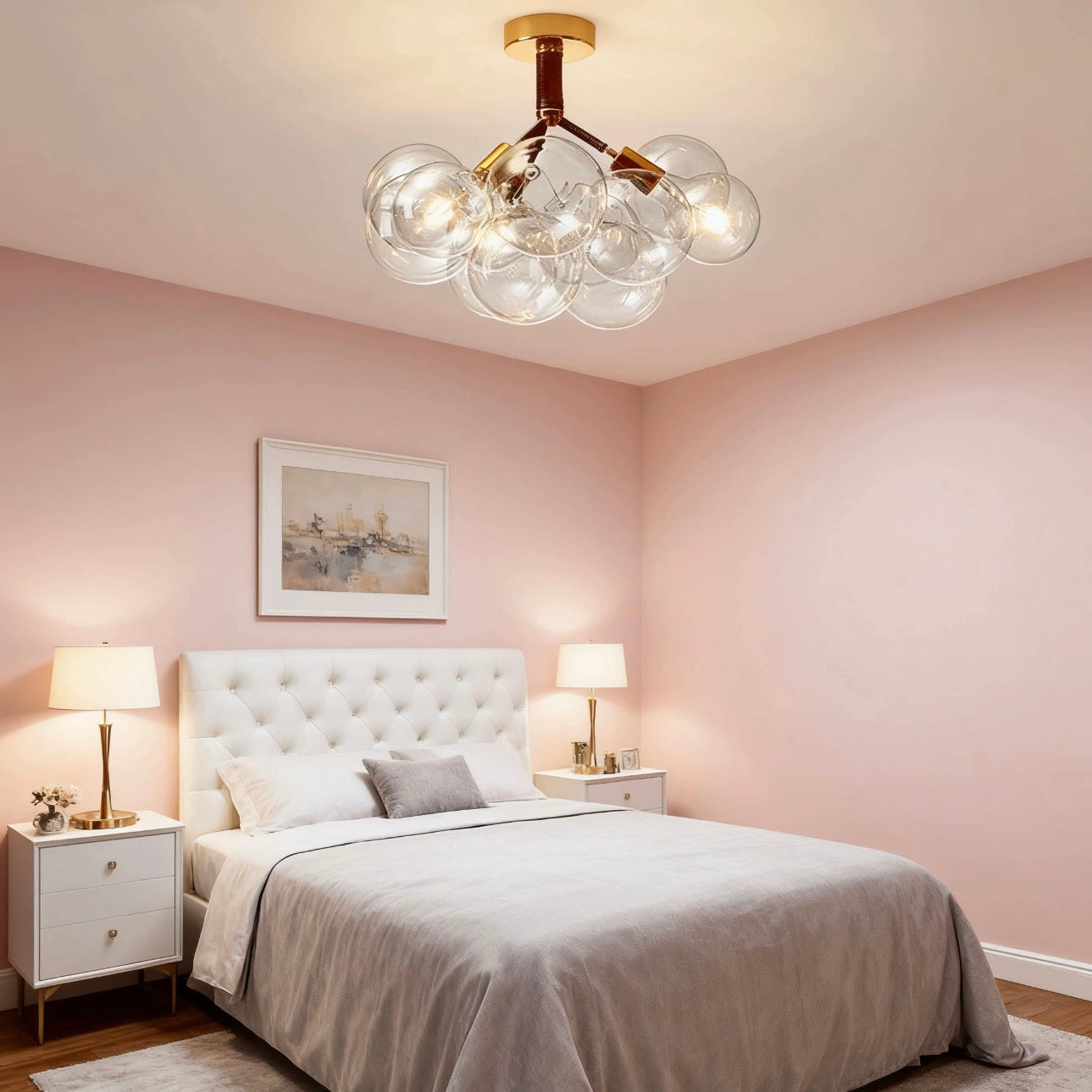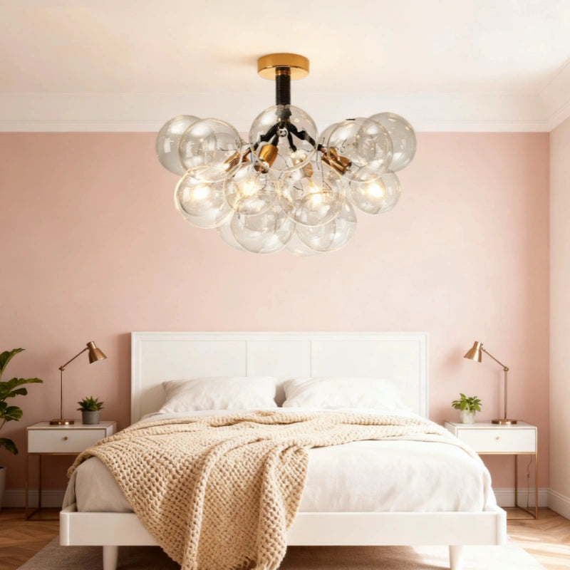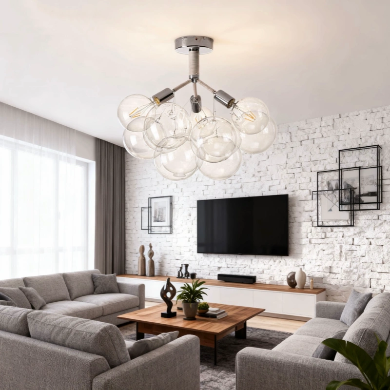 Esta lámpara de techo de vidrio con diseño de burbujas creativas está fabricada con una pantalla de vidrio soplado a mano. Con materiales de alta calidad y una meticulosa técnica de soplado artesanal, ofrece una excelente transmisión de luz, superficie lisa y uniforme, y una gran durabilidad. El cuerpo de la lámpara está compuesto por metal con acabado galvanizado, lo que garantiza un trabajo refinado, una superficie suave como la seda, y protección contra la oxidación y la corrosión, asegurando una vida útil prolongada. Utiliza un casquillo E27 estándar, compatible con bombillas LED, de bajo consumo o incandescentes. Disponibles en varios estilos, para adaptarse a sus necesidades, esta lámpara es la elección perfecta para la decoración interior.