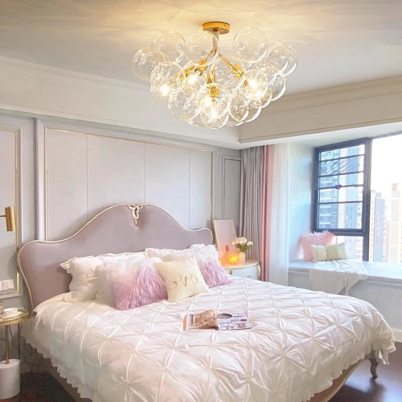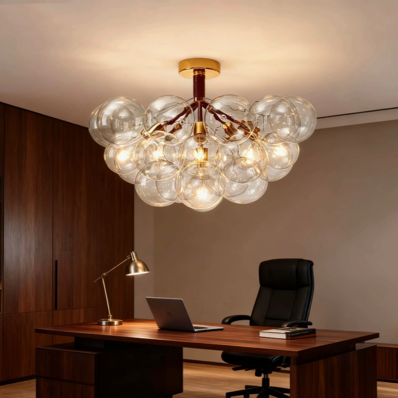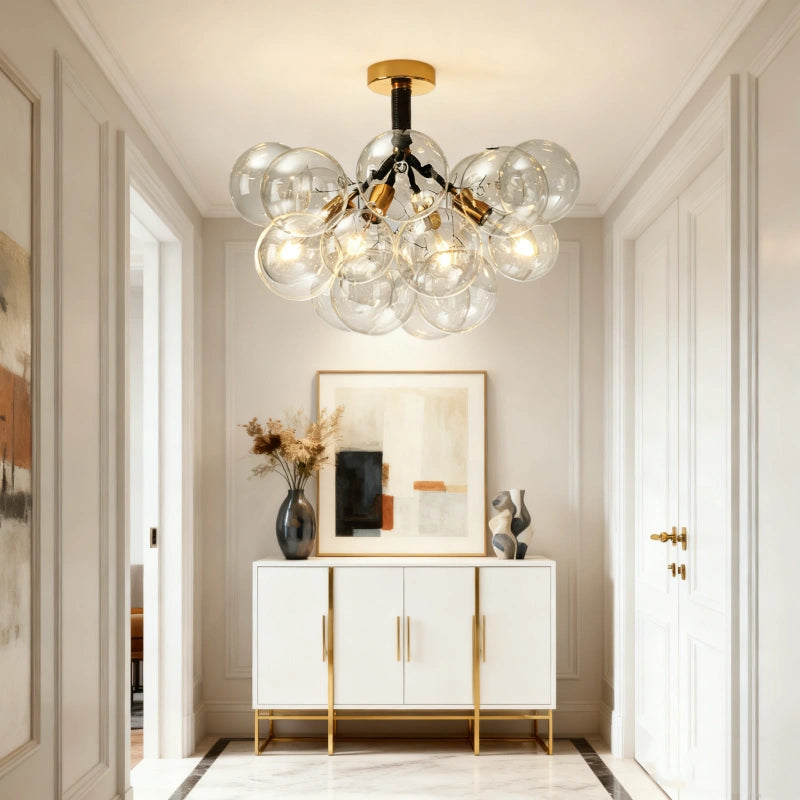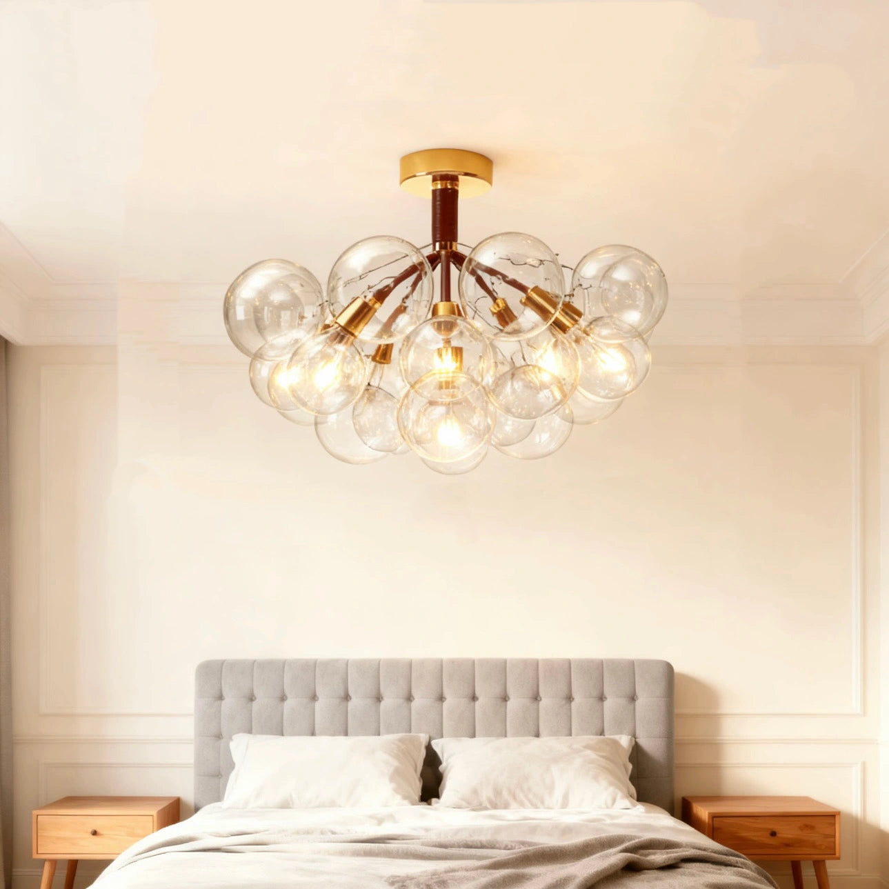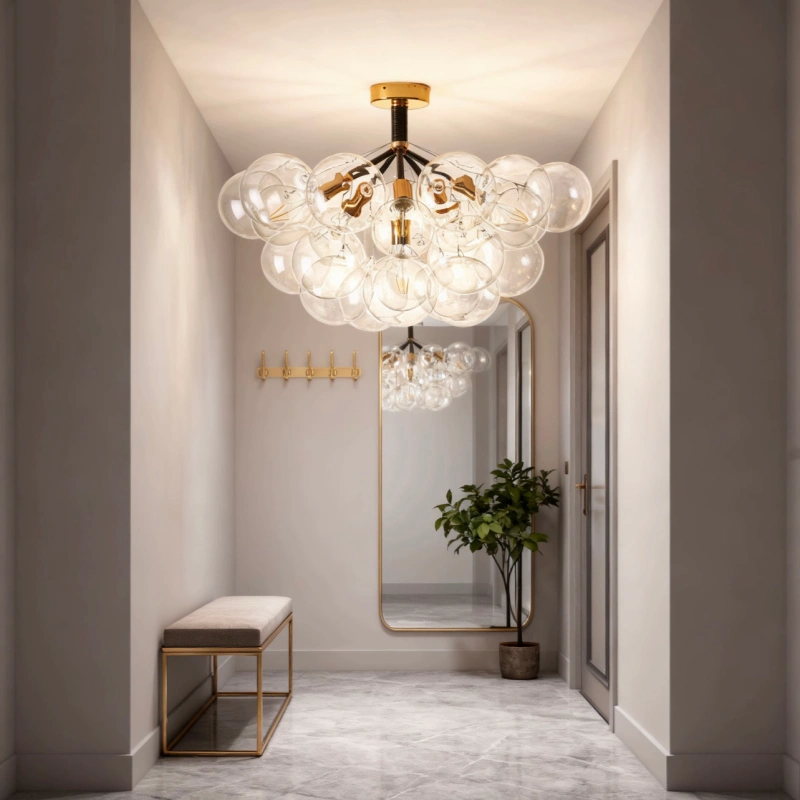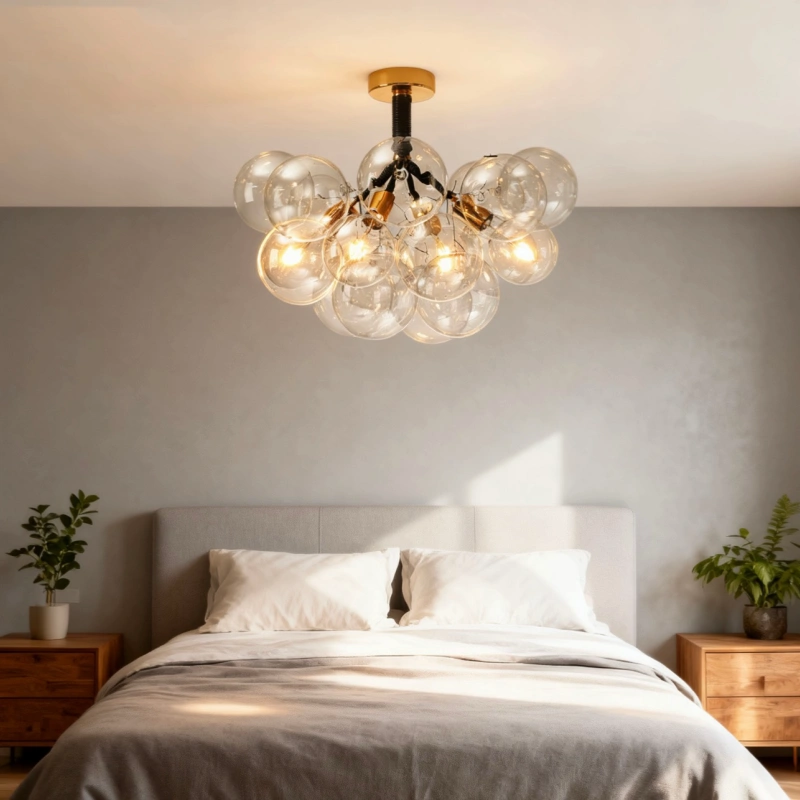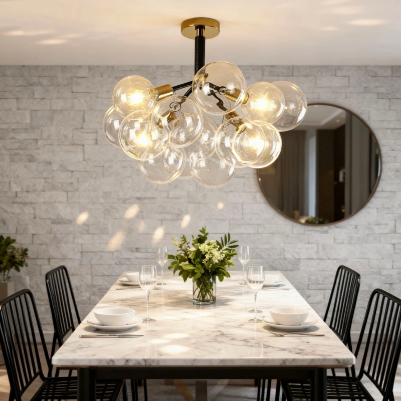 Esta lámpara de techo de vidrio con diseño de burbujas creativas está fabricada con una pantalla de vidrio soplado a mano. Con materiales de alta calidad y una meticulosa técnica de soplado artesanal, ofrece una excelente transmisión de luz, superficie lisa y uniforme, y una gran durabilidad. El cuerpo de la lámpara está compuesto por metal con acabado galvanizado, lo que garantiza un trabajo refinado, una superficie suave como la seda, y protección contra la oxidación y la corrosión, asegurando una vida útil prolongada. Utiliza un casquillo E27 estándar, compatible con bombillas LED, de bajo consumo o incandescentes. Disponibles en varios estilos, para adaptarse a sus necesidades, esta lámpara es la elección perfecta para la decoración interior.