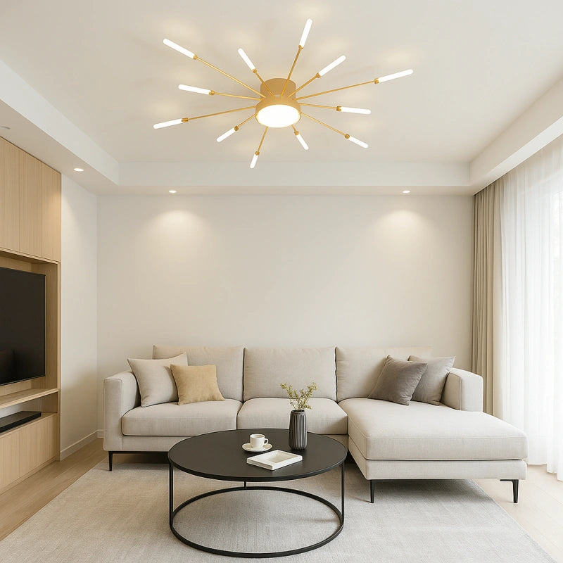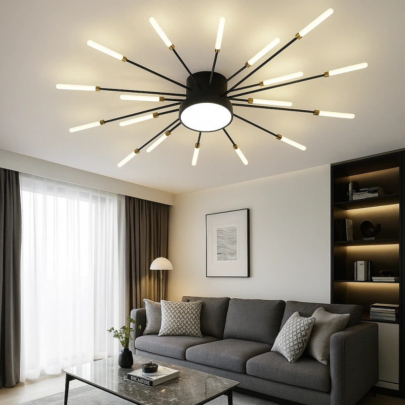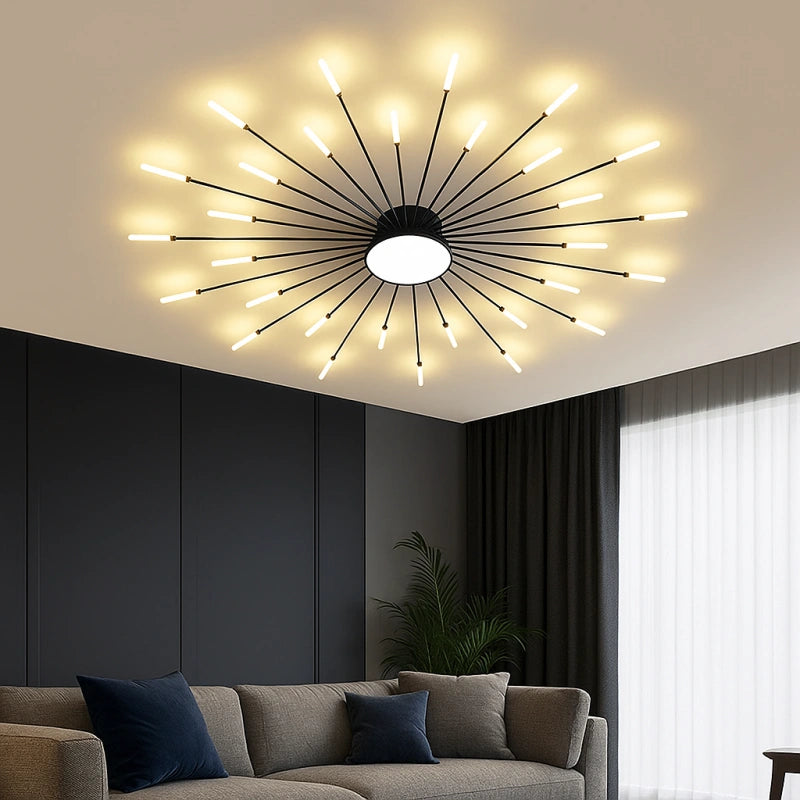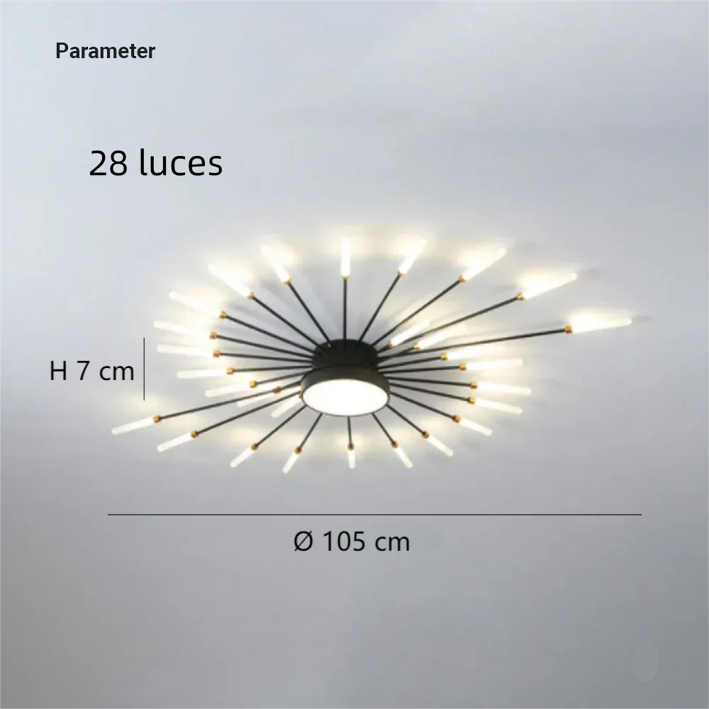 Esta lámpara de techo LED moderna con forma de fuegos artificiales y focos para salón está inspirada en un diseño de radiación estelar. El cuerpo de la lámpara está fabricado con metal de alta calidad, tratado mediante un proceso de pintura al horno y oxidación a alta temperatura, lo que garantiza un color uniforme, resistente a la corrosión y con una apariencia sólida y elegante. En el centro incorpora una fuente de luz LED tipo foco, mientras que los múltiples brazos radiales se distribuyen de manera uniforme y se combinan con pantallas de acrílico de alta transmitancia, logrando una iluminación suave y fluida. La fuente de luz LED de alta luminosidad y alto índice de reproducción cromática no produce parpadeos visibles, creando un ambiente cálido y confortable. Su diseño general es sencillo y sofisticado, con un equilibrio entre arte y funcionalidad, siendo la elección ideal para aportar un toque de elegancia y estilo a los espacios más refinados.