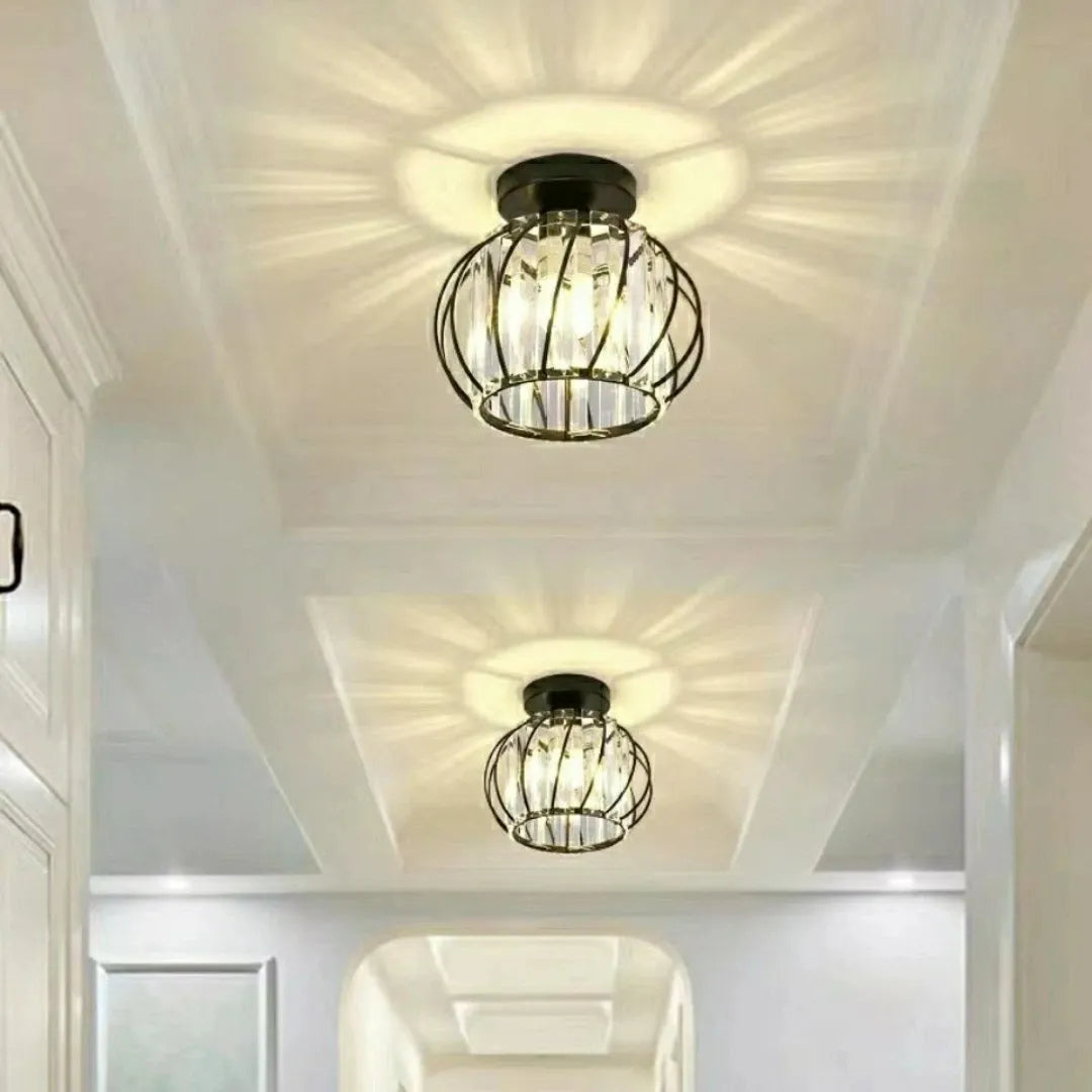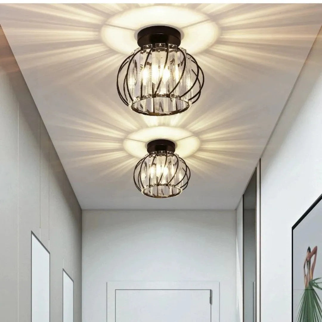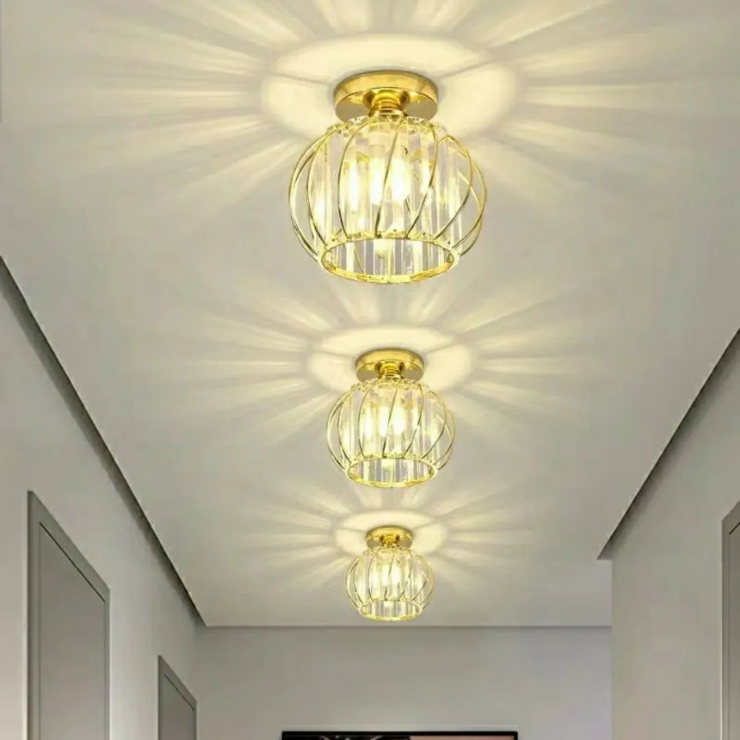 La lámpara de techo de cristal incorpora detalles de cristal brillante que reflejan la luz, generando un efecto luminoso elegante y sofisticado. Su base metálica de alta calidad es resistente, anticorrosiva y segura, con gran capacidad de carga. Además, cuenta con casquillo E27 que facilita el reemplazo de la bombilla. Con certificación CE, es una opción fiable dentro de las lámparas de techo para pasillos modernas, perfecta para pasillos y recibidores.
