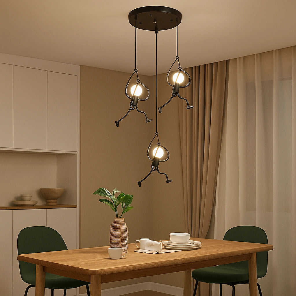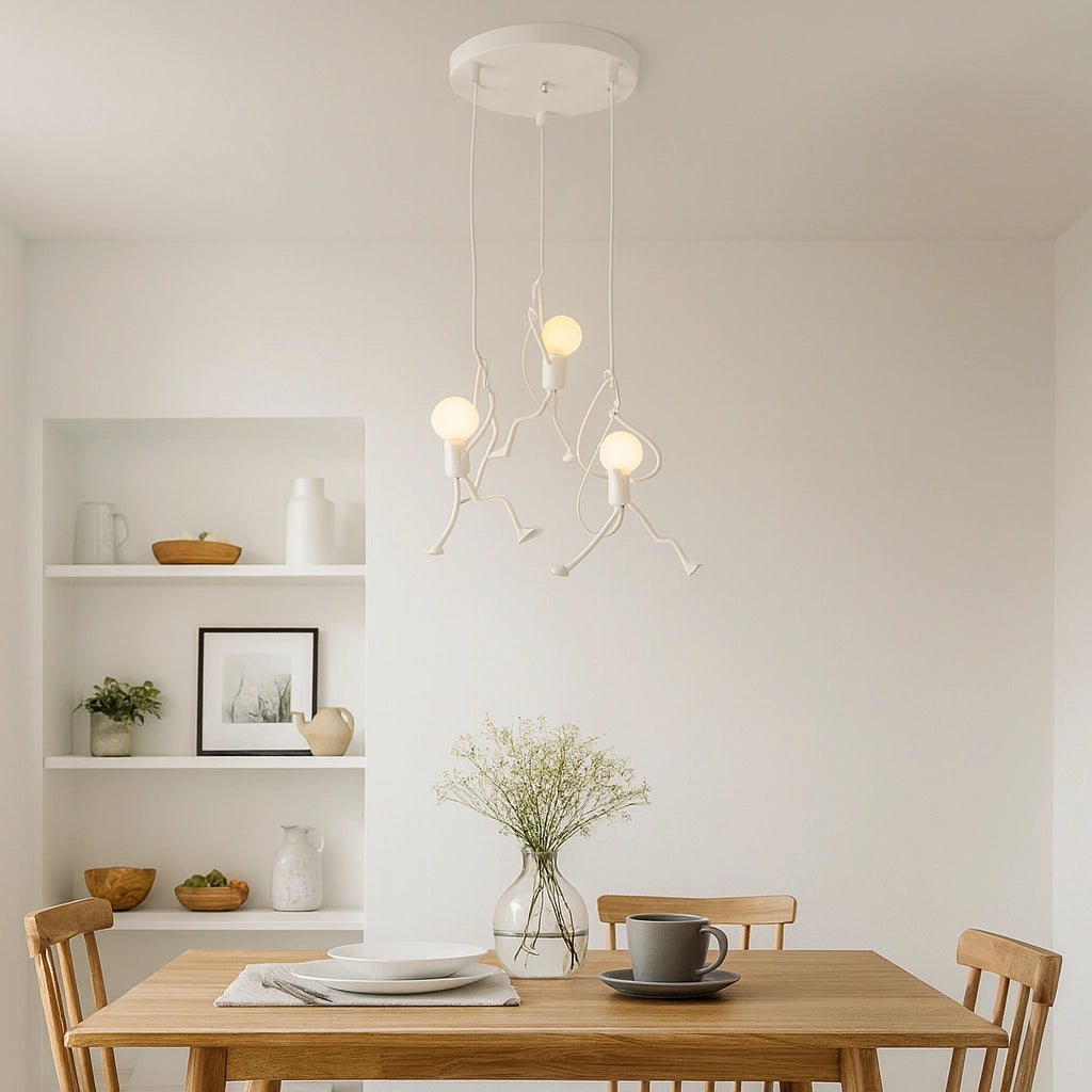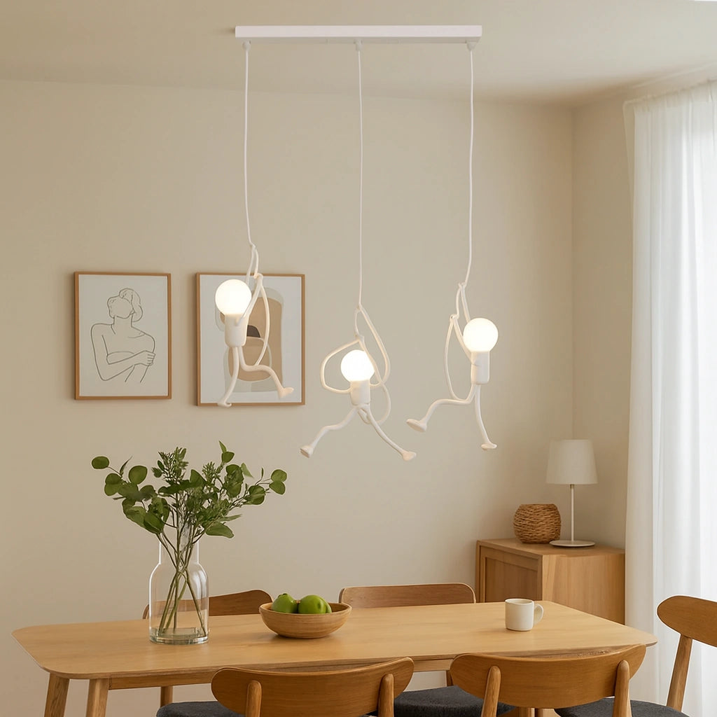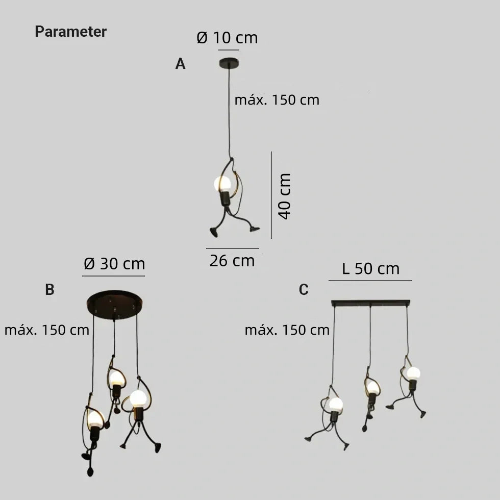 Esta lámpara colgante de hierro con diseño creativo de pequeño hombre aporta un toque original y divertido al cabecero. Su cuerpo metálico de alta calidad y el plafón de hierro grueso garantizan resistencia y durabilidad. Disponible en blanco y negro con varias medidas, incorpora casquillo E27 compatible con diferentes fuentes de luz, uniendo estilo y funcionalidad.