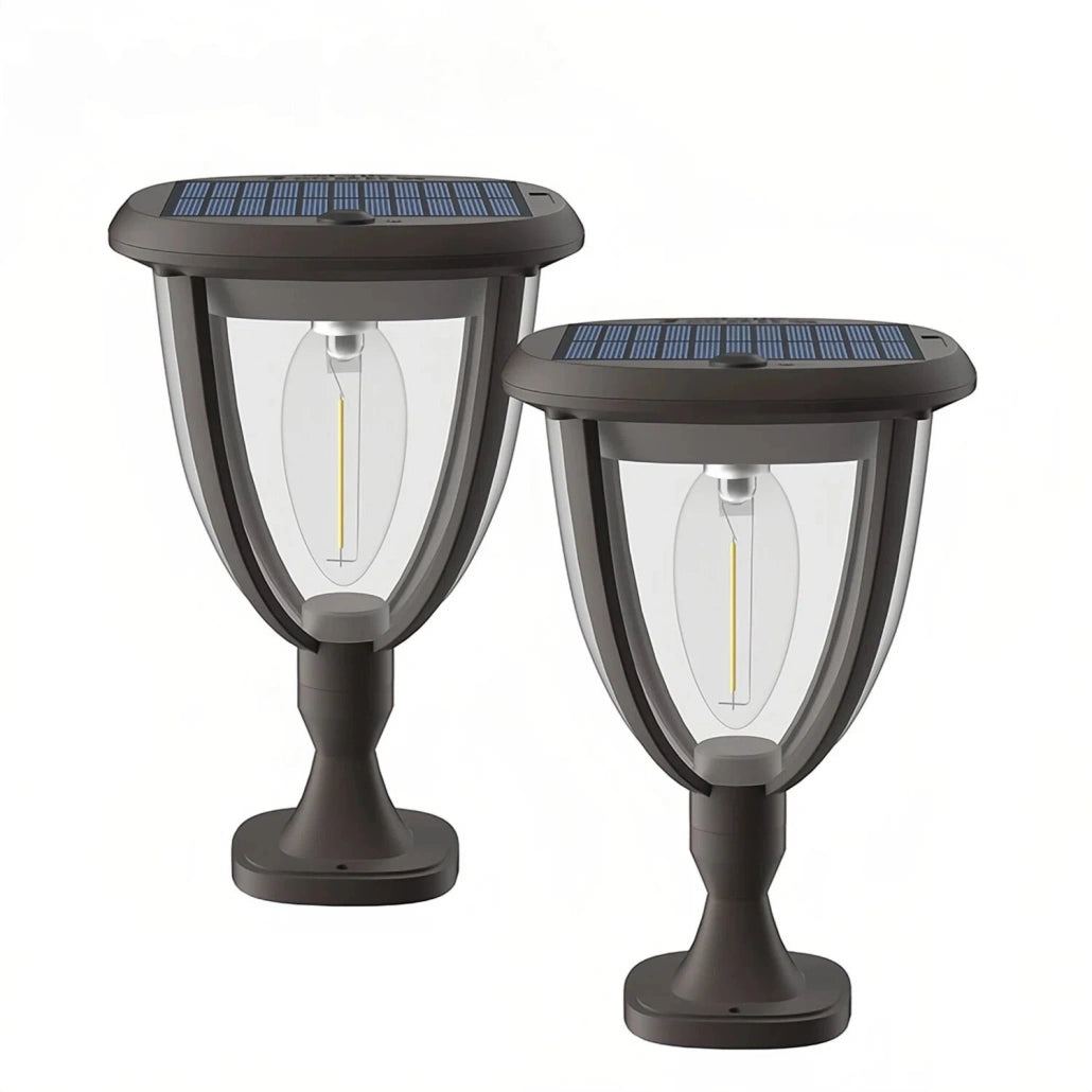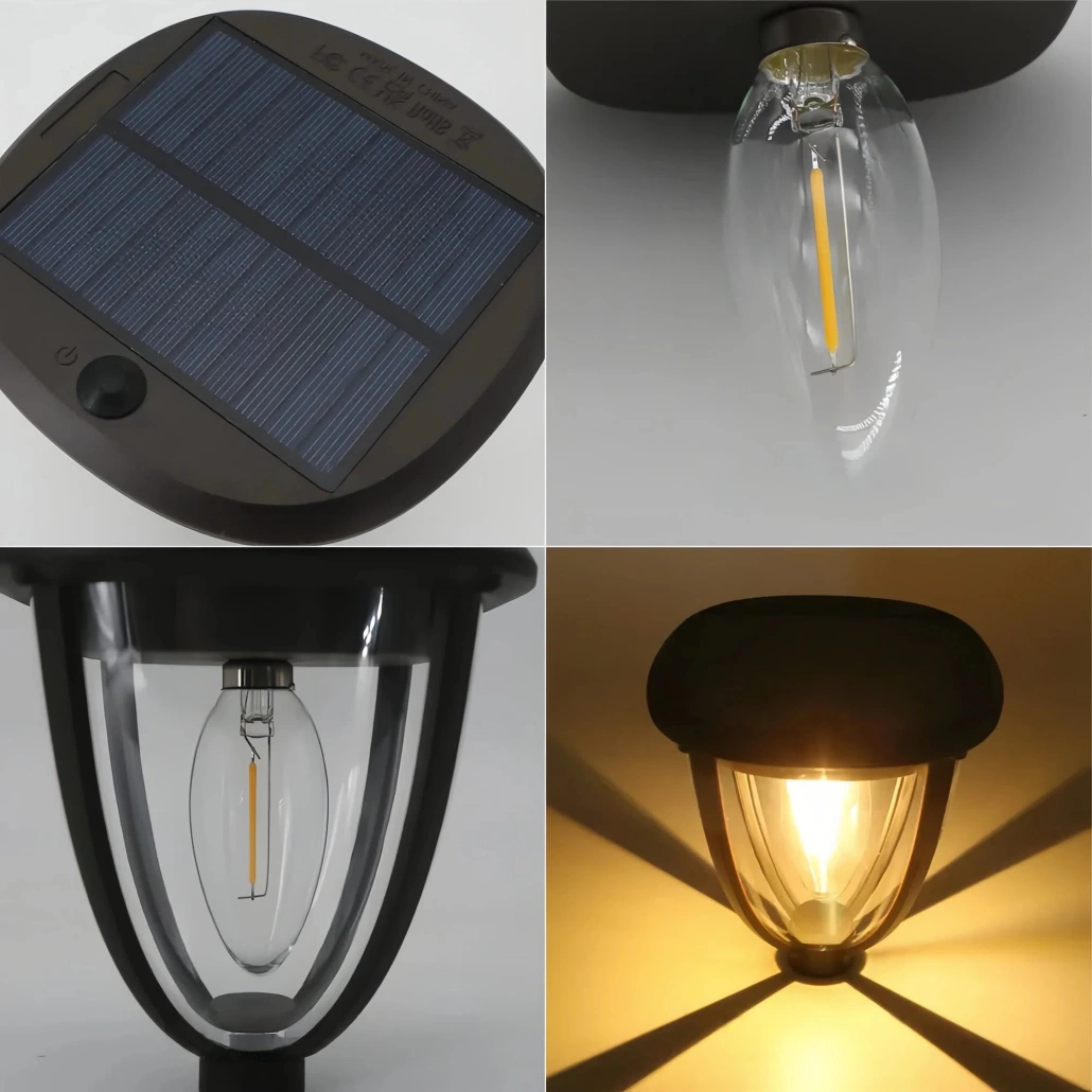 Lámpara solar de exterior en formato farol negro LED IP65 (pack de 2), diseñada para ofrecer una iluminación eficiente, duradera y elegante en cualquier espacio exterior.