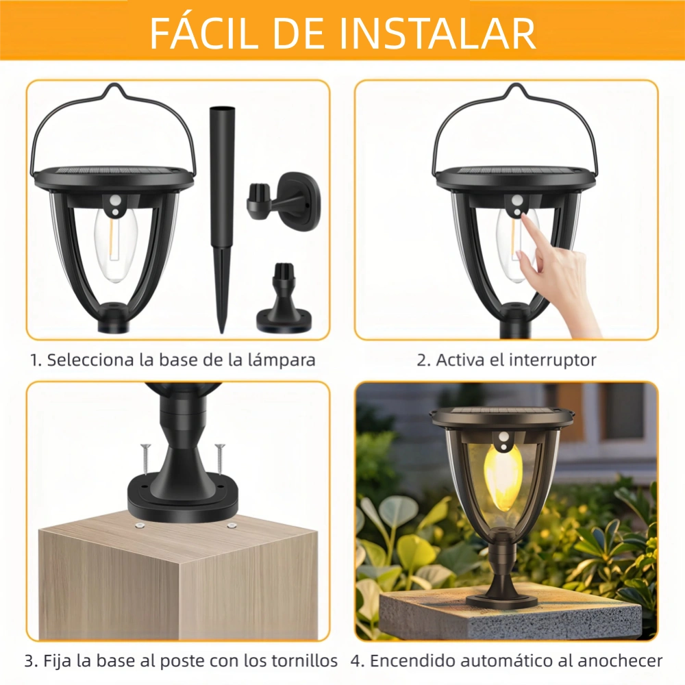 Este farol solar exterior LED IP65 es ideal para espacios como porches, jardines, terrazas o como farol solar para jardín, aportando funcionalidad y estilo. Su diseño como lámpara solar negra exterior combina perfectamente con cualquier decoración.