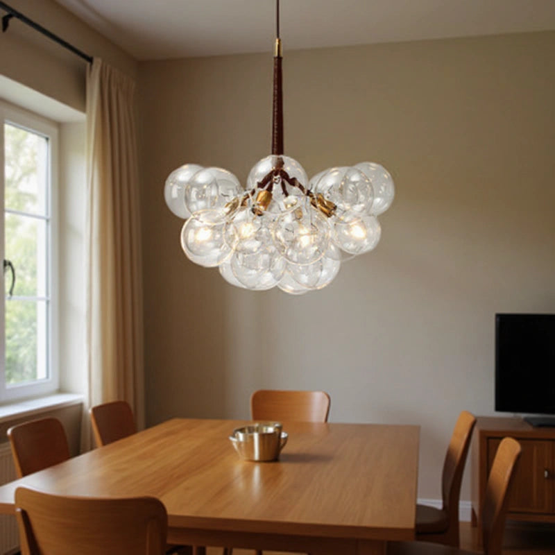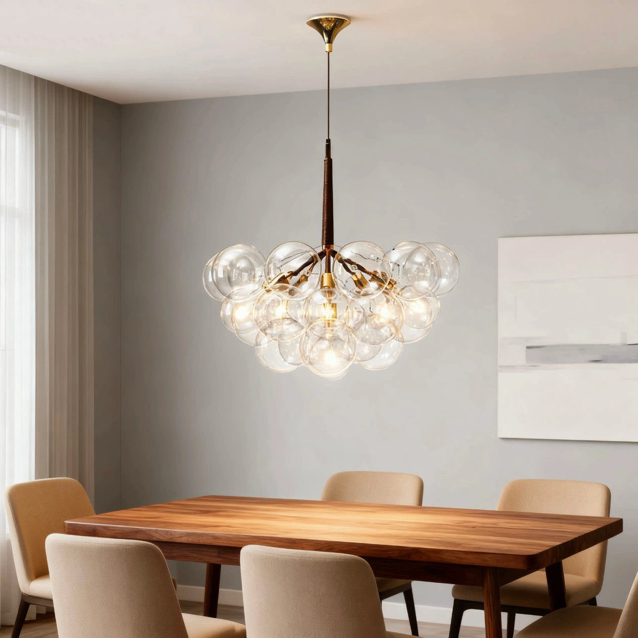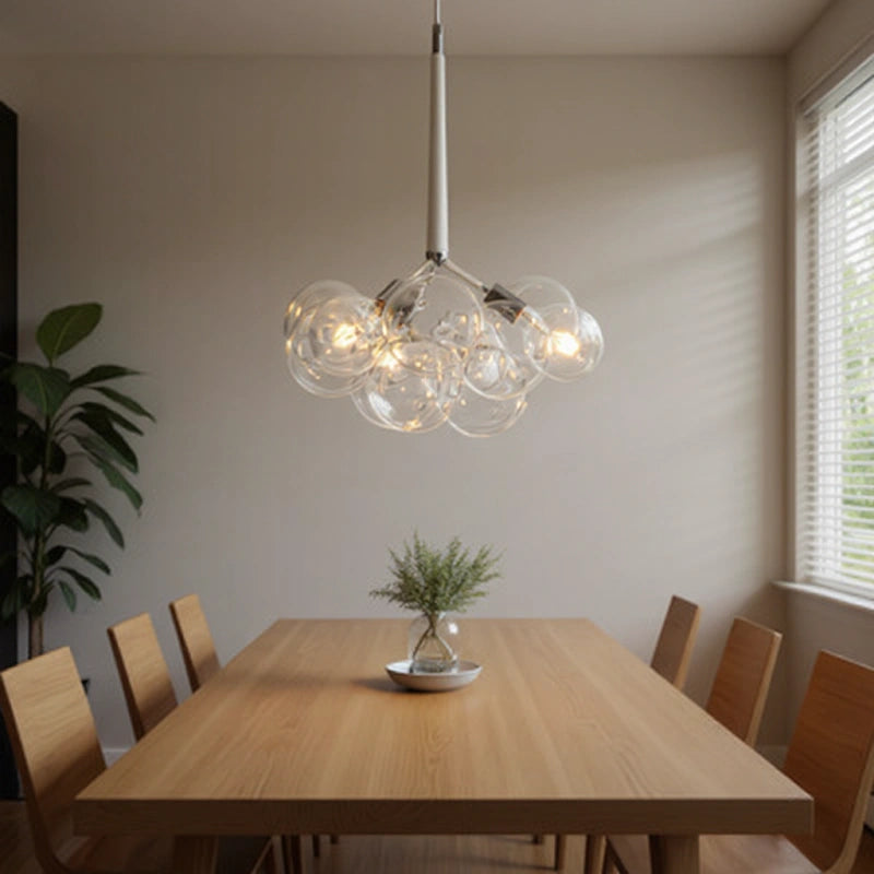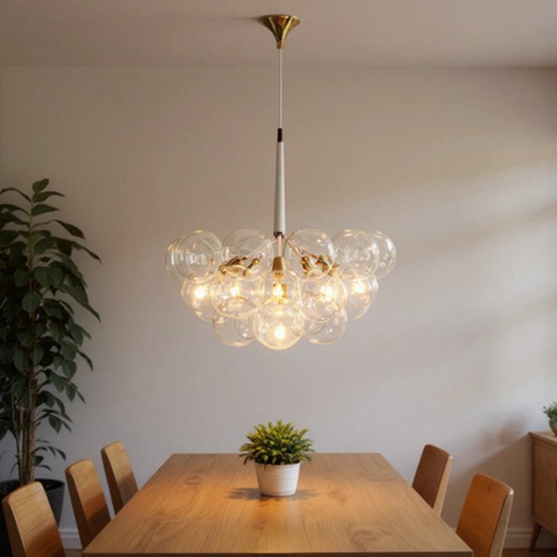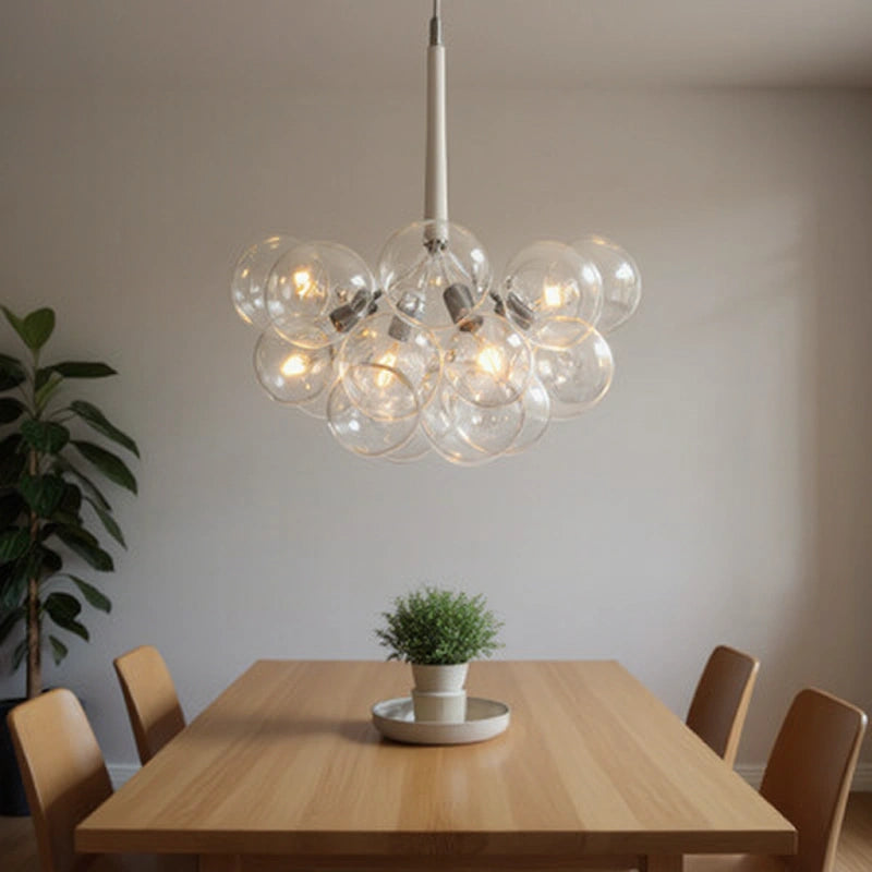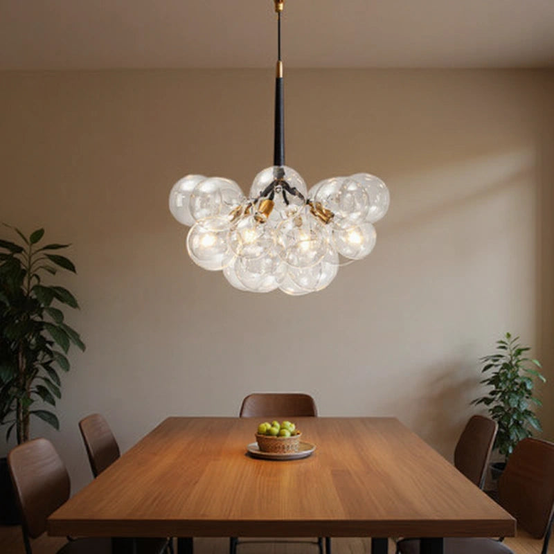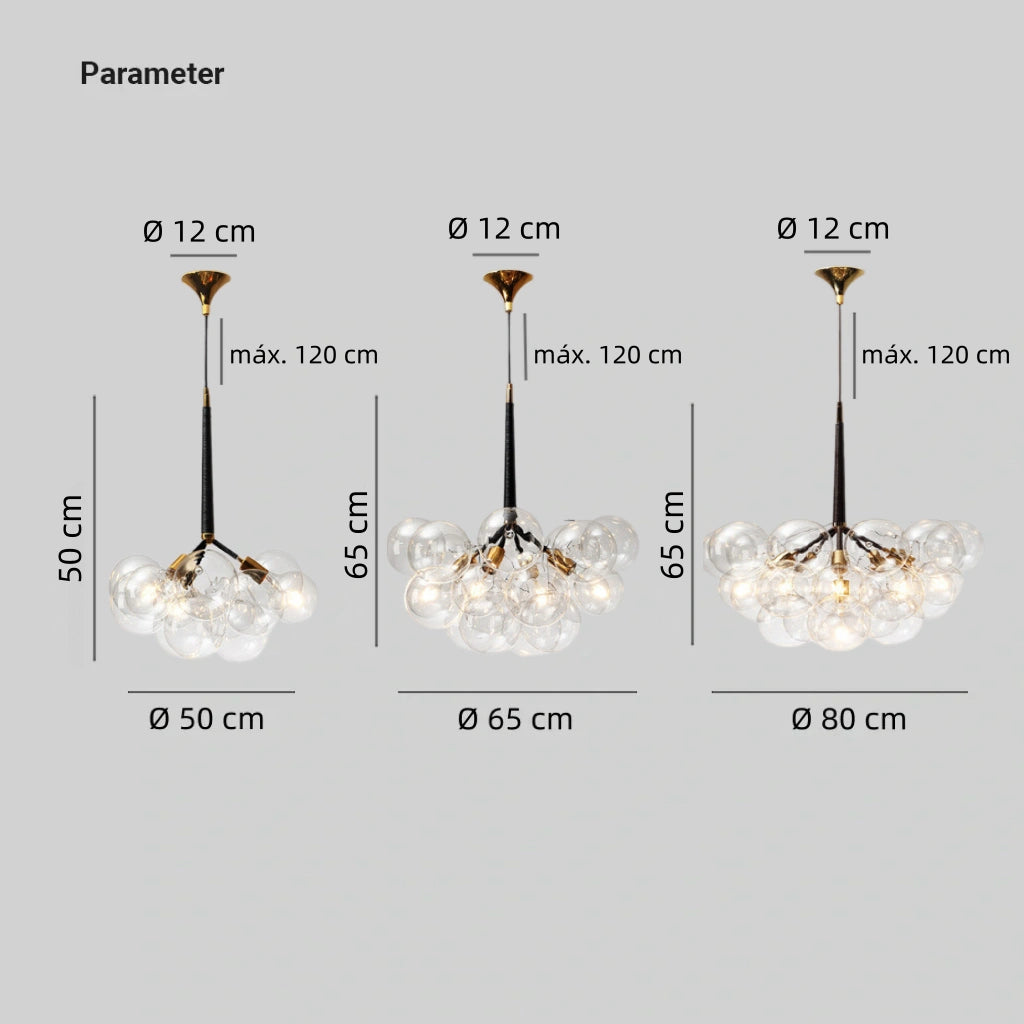 Su diseño tipo burbuja, propio de una lámpara de vidrio tipo burbuja, integra múltiples esferas de cristal que difunden la luz de manera suave gracias a su fuente LED de alta calidad, ofreciendo una iluminación cálida y confortable. Esta lámpara de araña de vidrio crea un ambiente acogedor y moderno, ideal para el hogar.