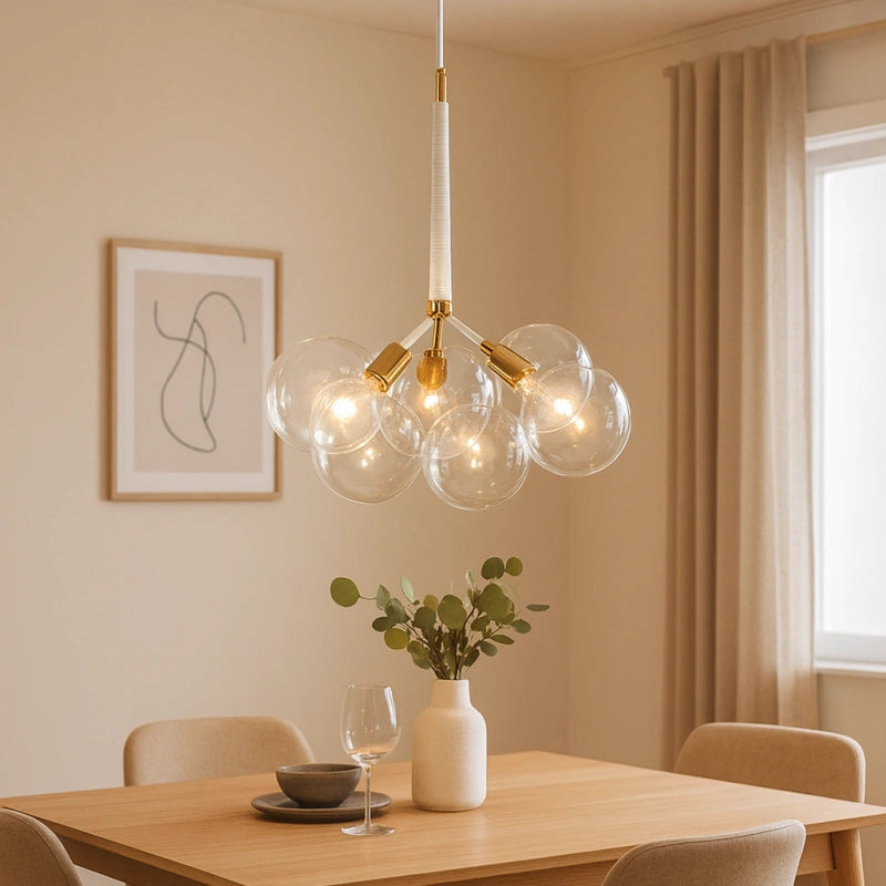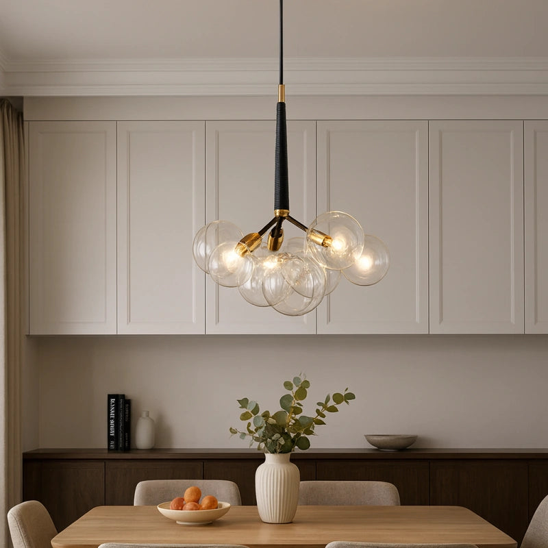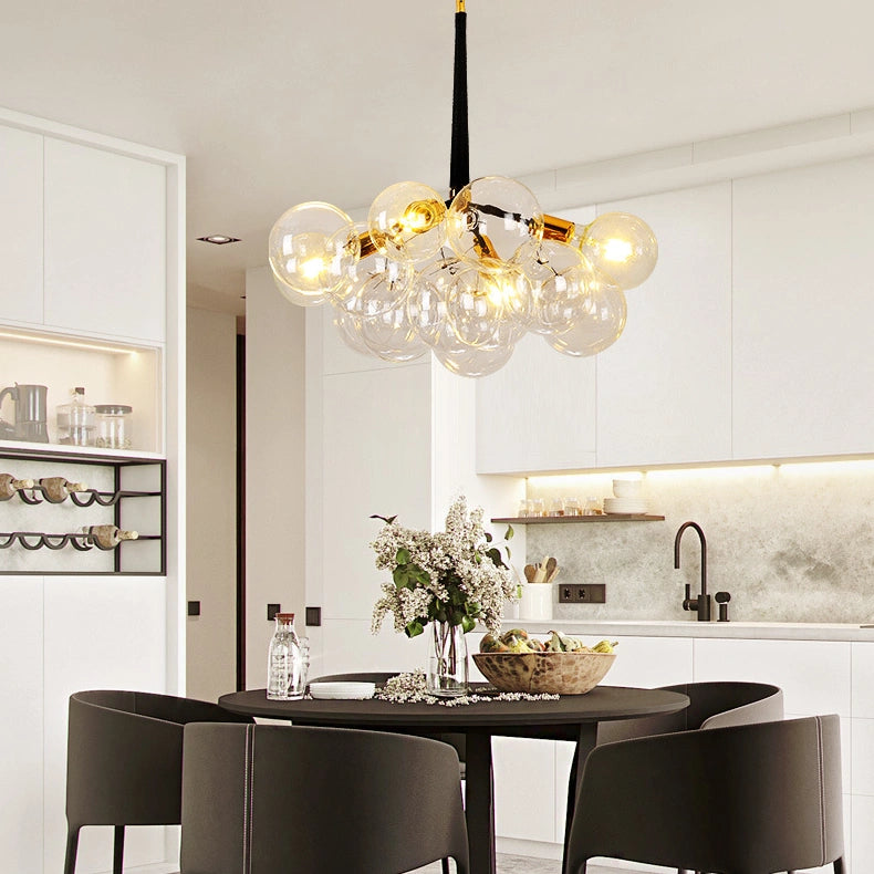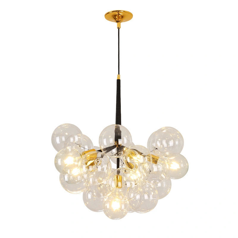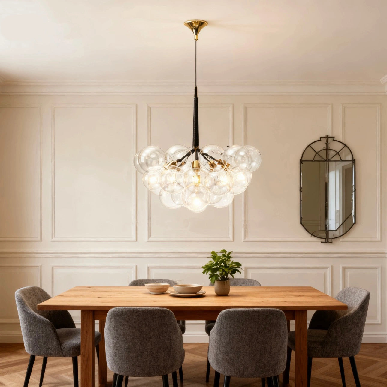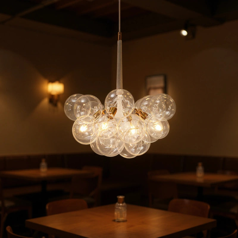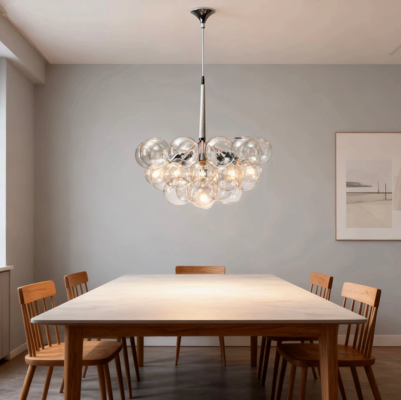Su diseño tipo burbuja, propio de una lámpara de vidrio tipo burbuja, integra múltiples esferas de cristal que difunden la luz de manera suave gracias a su fuente LED de alta calidad, ofreciendo una iluminación cálida y confortable. Esta lámpara de araña de vidrio crea un ambiente acogedor y moderno, ideal para el hogar.