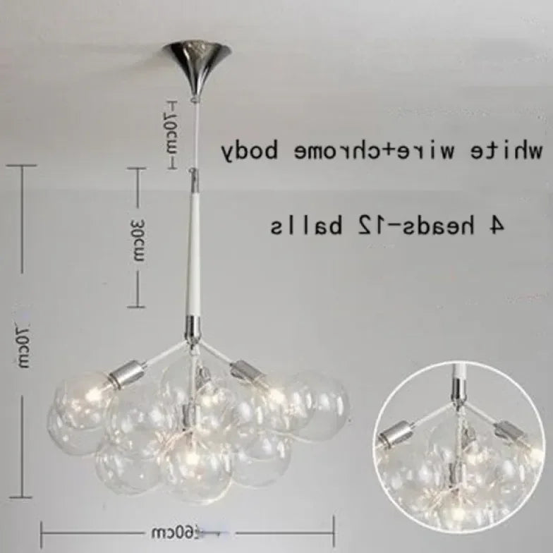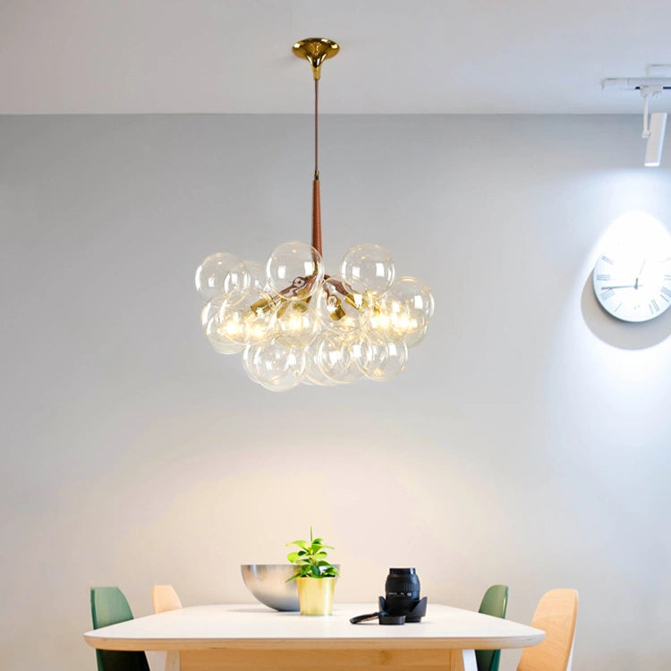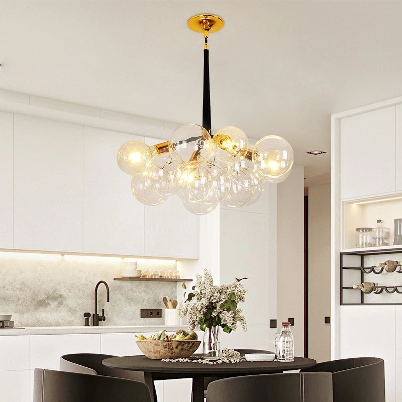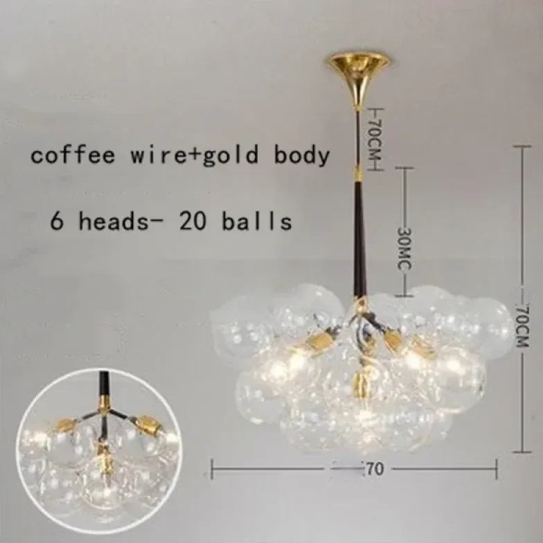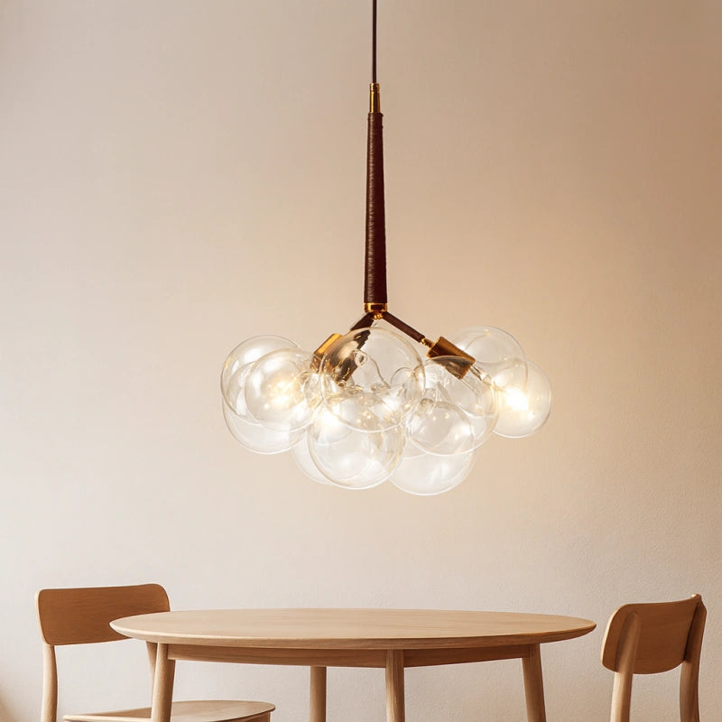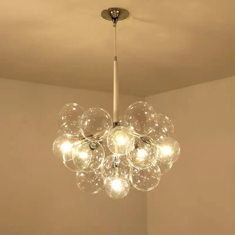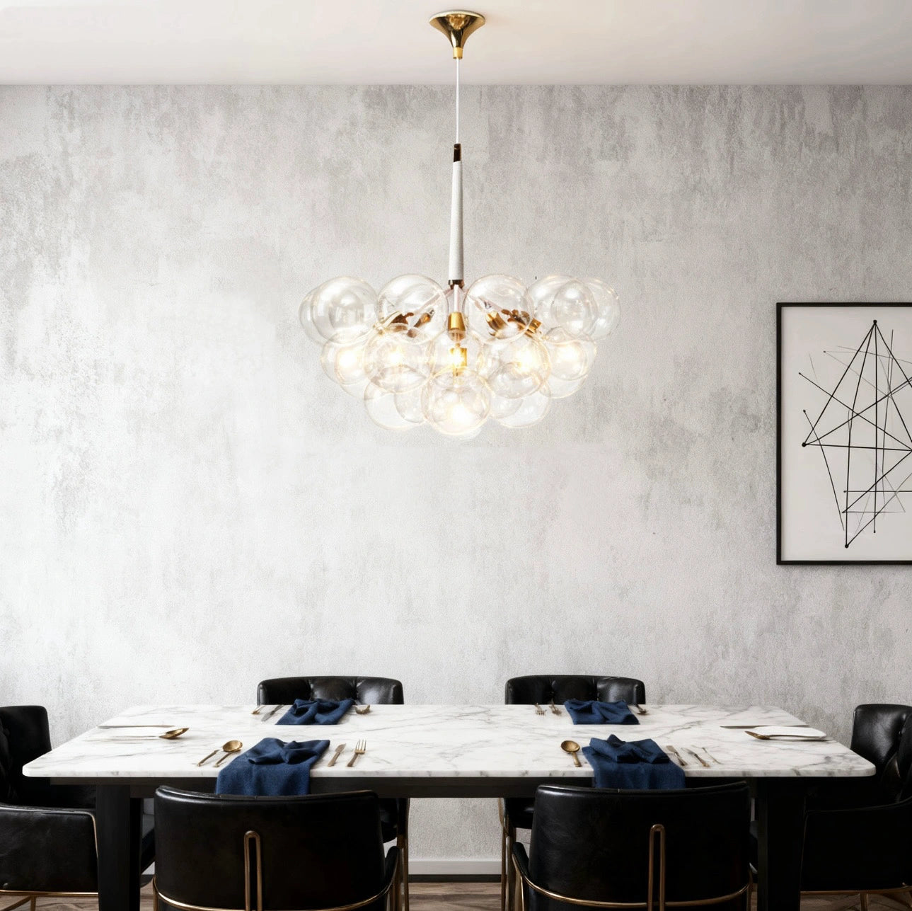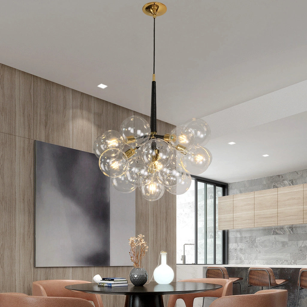 Su diseño tipo burbuja, propio de una lámpara de vidrio tipo burbuja, integra múltiples esferas de cristal que difunden la luz de manera suave gracias a su fuente LED de alta calidad, ofreciendo una iluminación cálida y confortable. Esta lámpara de araña de vidrio crea un ambiente acogedor y moderno, ideal para el hogar.