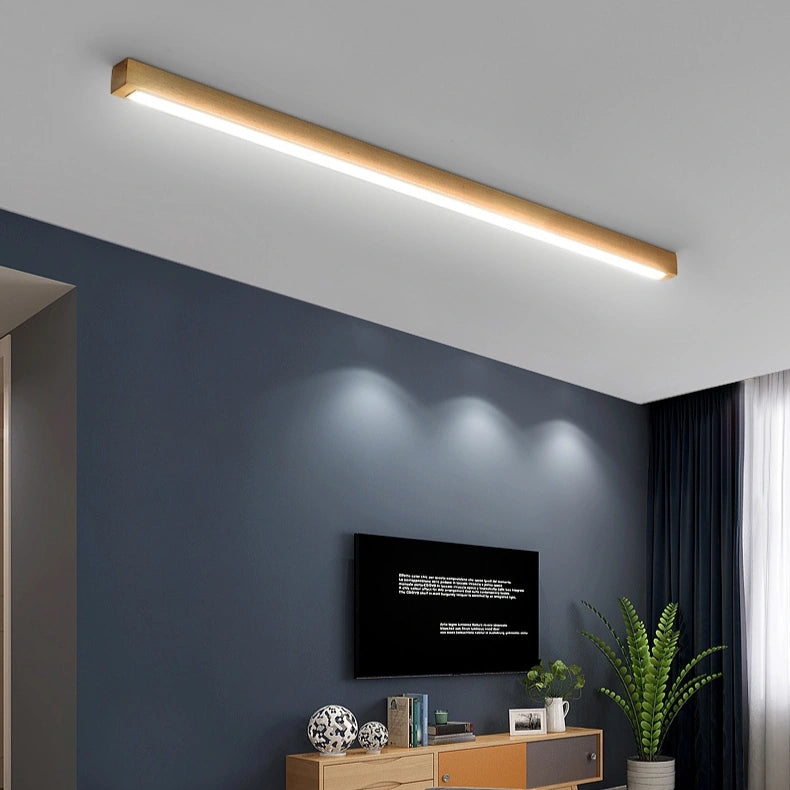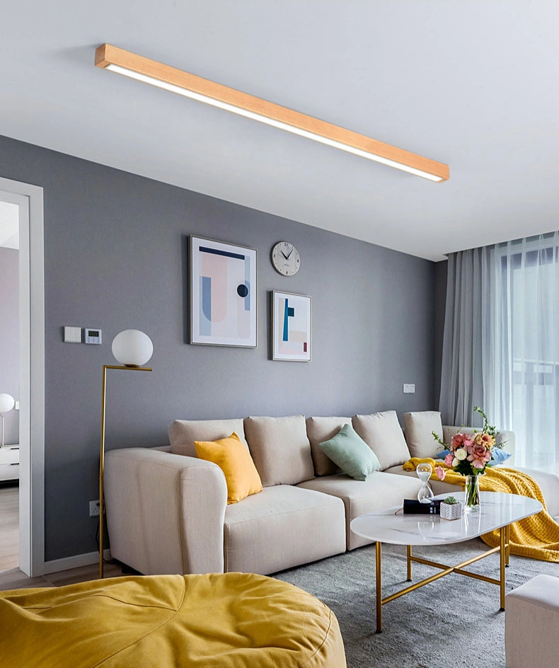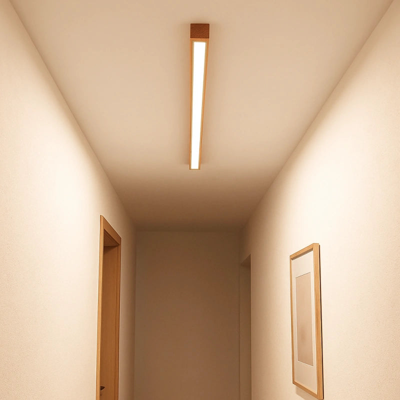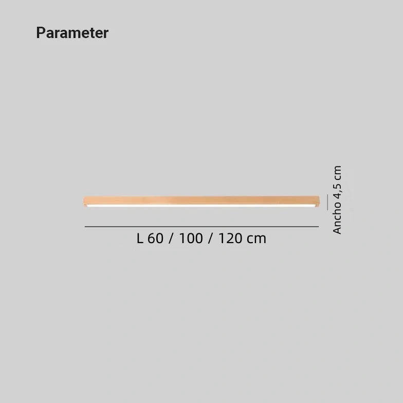 Esta lámpara de pasillo de techo LED de madera maciza estilo nórdico alargada, de estilo nórdico alargado, está fabricada con madera de haya, que presenta un veteado natural, es sólida y duradera, con una textura fina que combina una sensación cálida y una estructura estable, aportando al espacio un toque de naturaleza y calidez. La pantalla está hecha de acrílico de alta transmisión de luz, lo que proporciona una iluminación amplia, con una alta tasa de transmisión y una luz uniforme, suave y no deslumbrante; además, es resistente a la suciedad y fácil de limpiar. Utiliza una fuente de luz LED sin parpadeo, junto con un controlador de corriente constante inteligente, garantizando una iluminación estable que protege la vista, natural y sin parpadeos perceptibles. Su diseño lineal y minimalista, combinado con el tono cálido de la madera, ofrece eficiencia energética y una estética natural, siendo una opción ideal para pasillos y corredores.