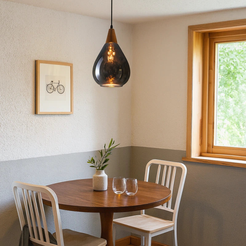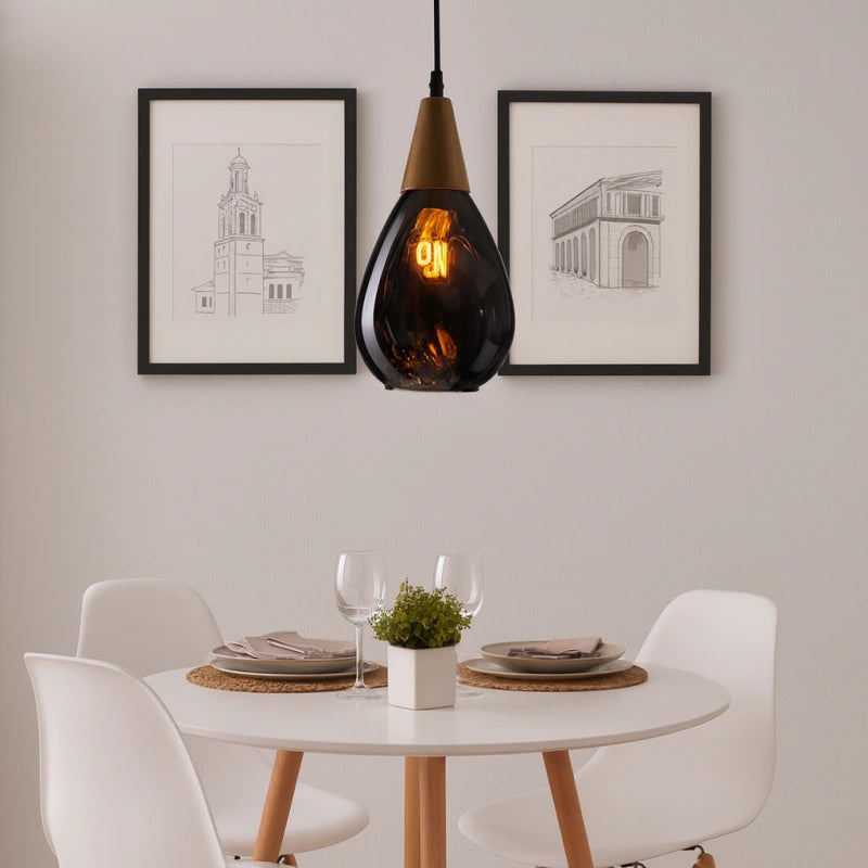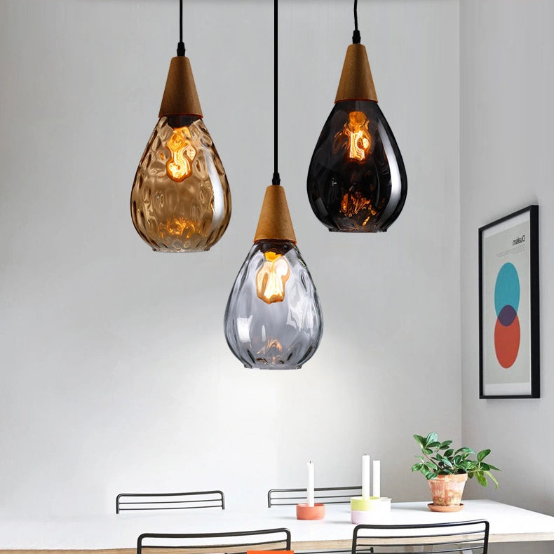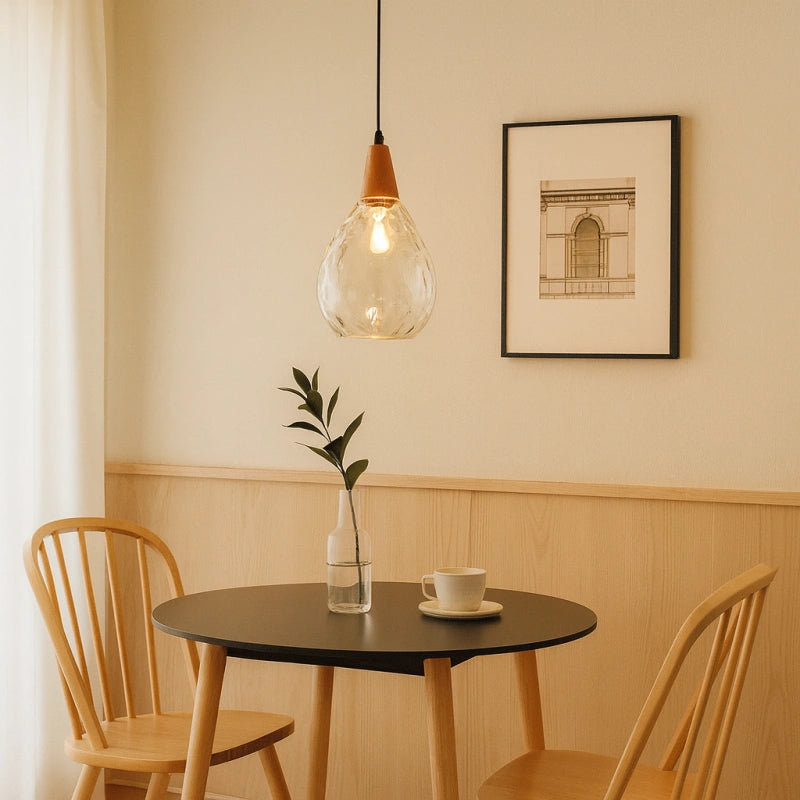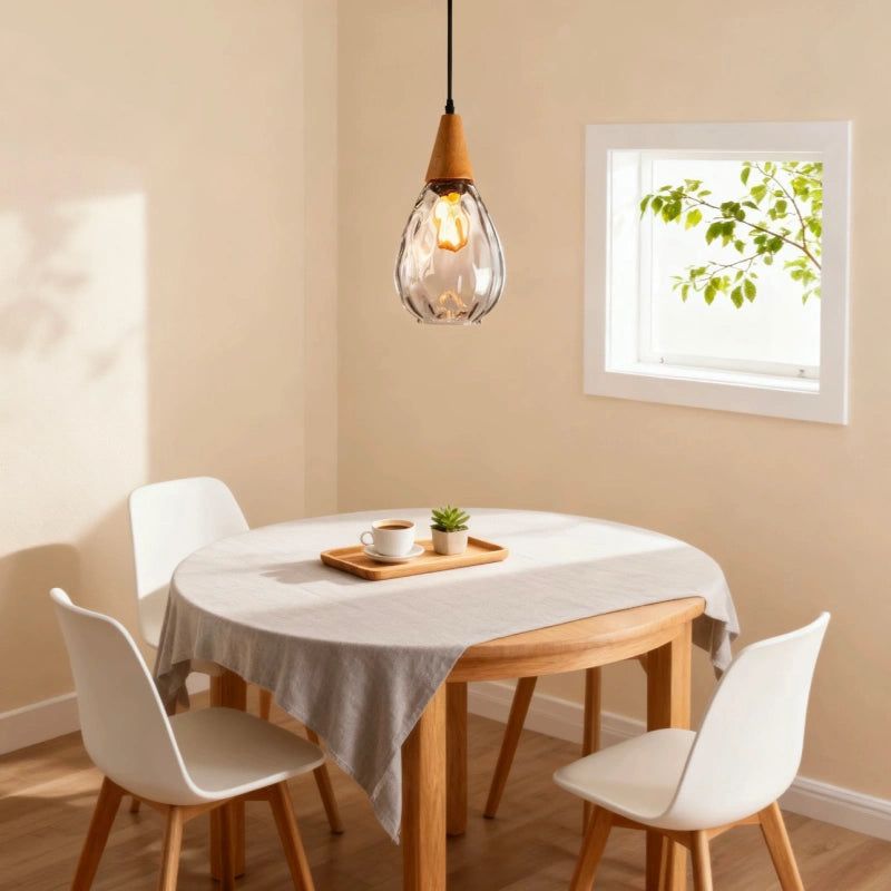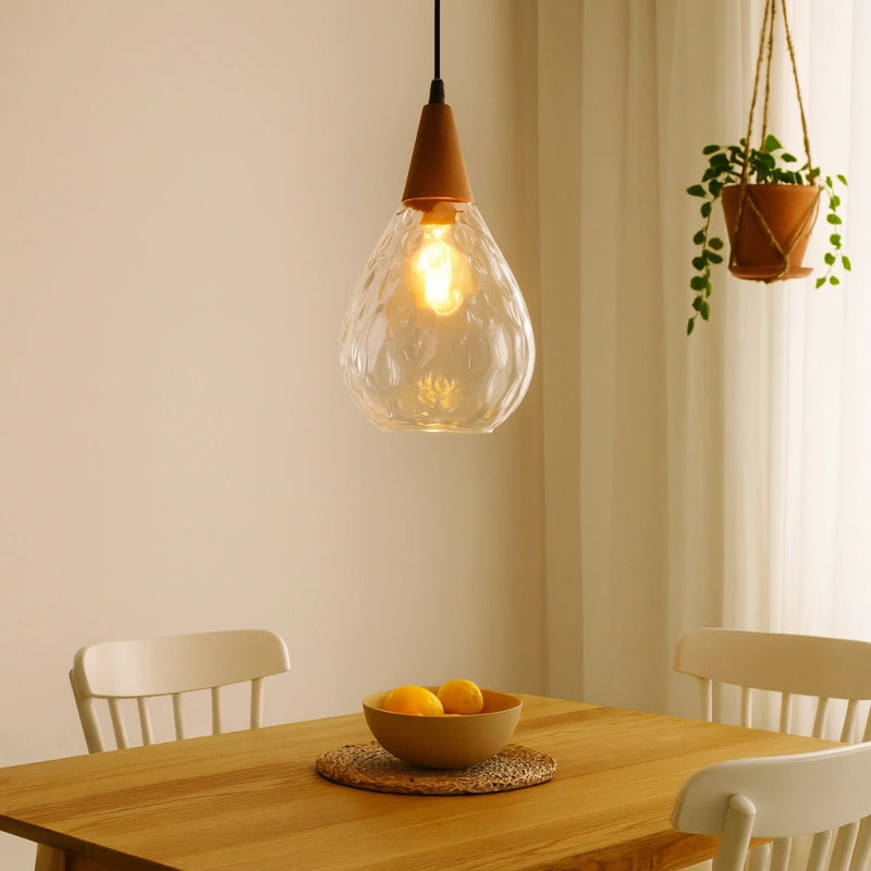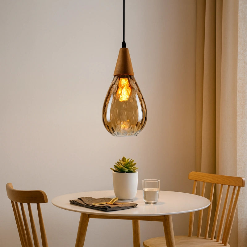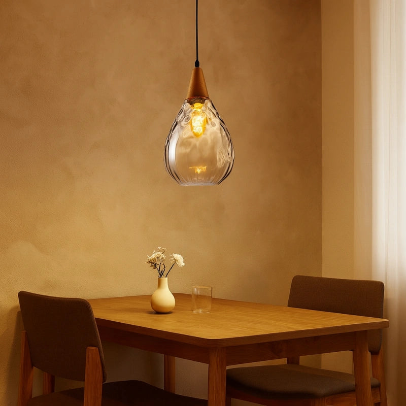 Esta lámpara colgante nórdica de vidrio en forma de gota para comedor presenta un diseño en forma de gota, con una pantalla de vidrio soplado a mano con patrón de ondas. El vidrio es grueso y ha sido tratado con un recubrimiento galvanizado, lo que la hace resistente y duradera. El soporte de madera se fusiona perfectamente con el vidrio soplado a mano, mostrando una exquisita artesanía. Su alta transmitancia de luz proporciona una iluminación suave y uniforme. Está equipada con una base E27 universal, lo que facilita el cambio de bombillas, siendo práctica y funcional para el uso diario. Colocada en cualquier espacio, aporta un toque único de encanto.