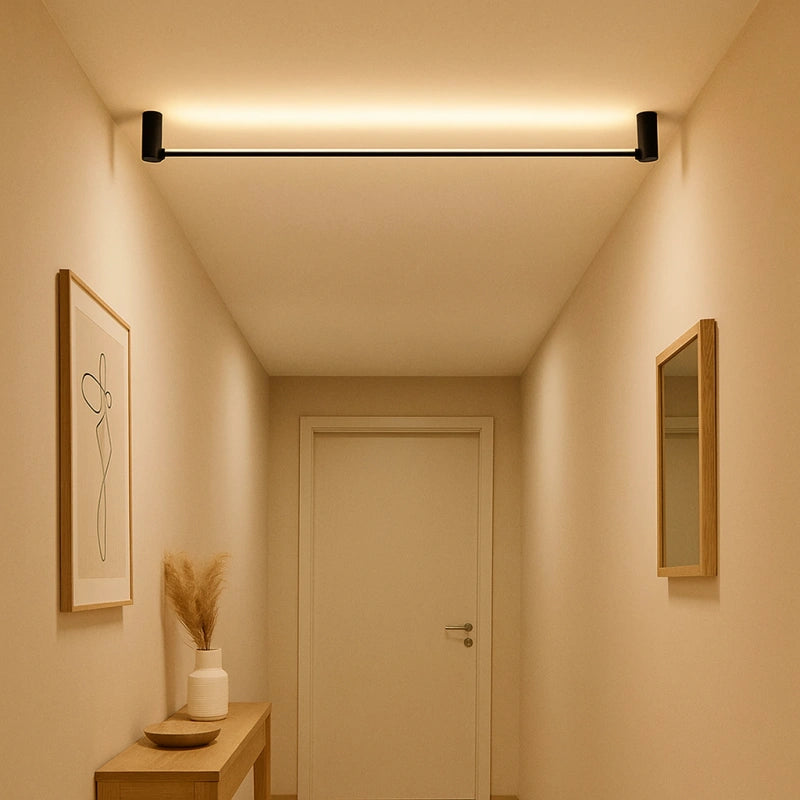 Lámpara de techo LED moderna de diseño lineal negro sin parpadeo, ideal para ambientes contemporáneos. Fabricada con un cuerpo de aluminio pintado anticorrosión y una pantalla de acrílico resistente al calor, garantiza durabilidad y alta luminosidad. Disponible en tres tamaños, perfecta para salones y otros espacios interiores.