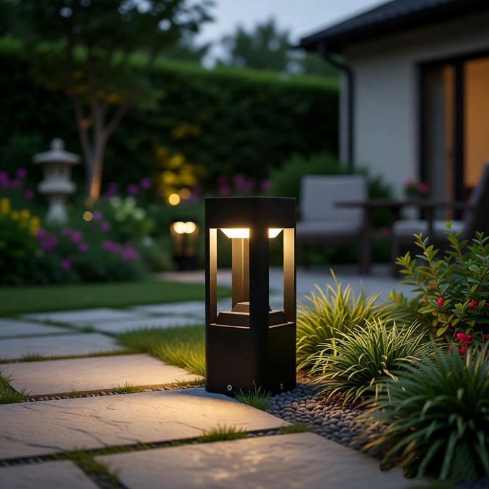 Baliza solar LED de jardín con sensor inteligente, luz suave y estructura metálica resistente para exterior