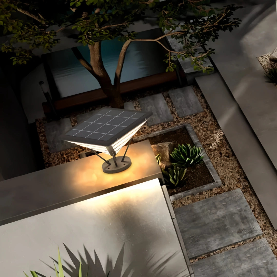 Las lamparas solares sobremuro combinan diseño moderno y eficiencia energética para iluminar exteriores con estilo. Este sobremuro moderno para jardín presenta una original estructura geométrica tipo sobremuro de triángulo invertido, aportando un toque distintivo a jardines y terrazas.