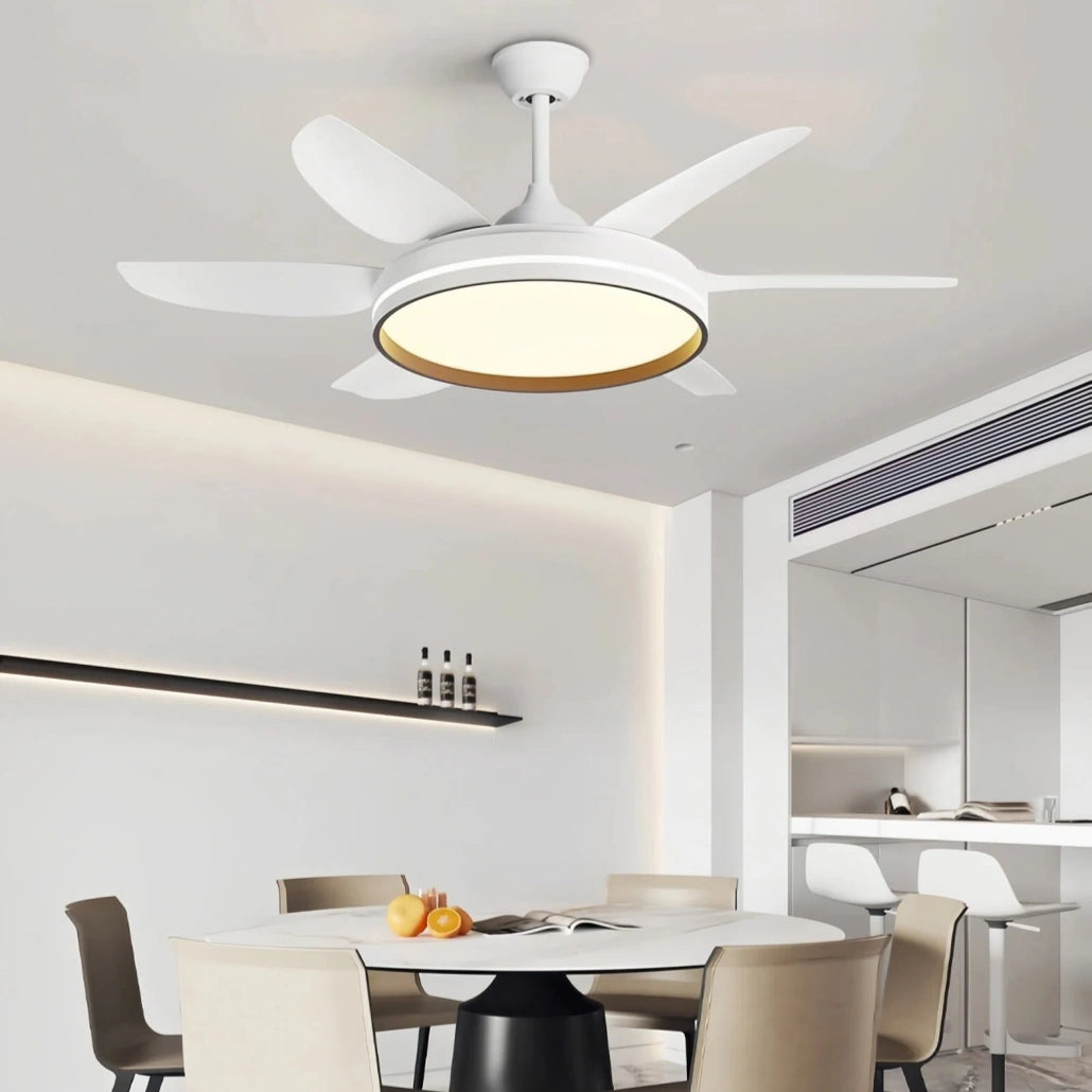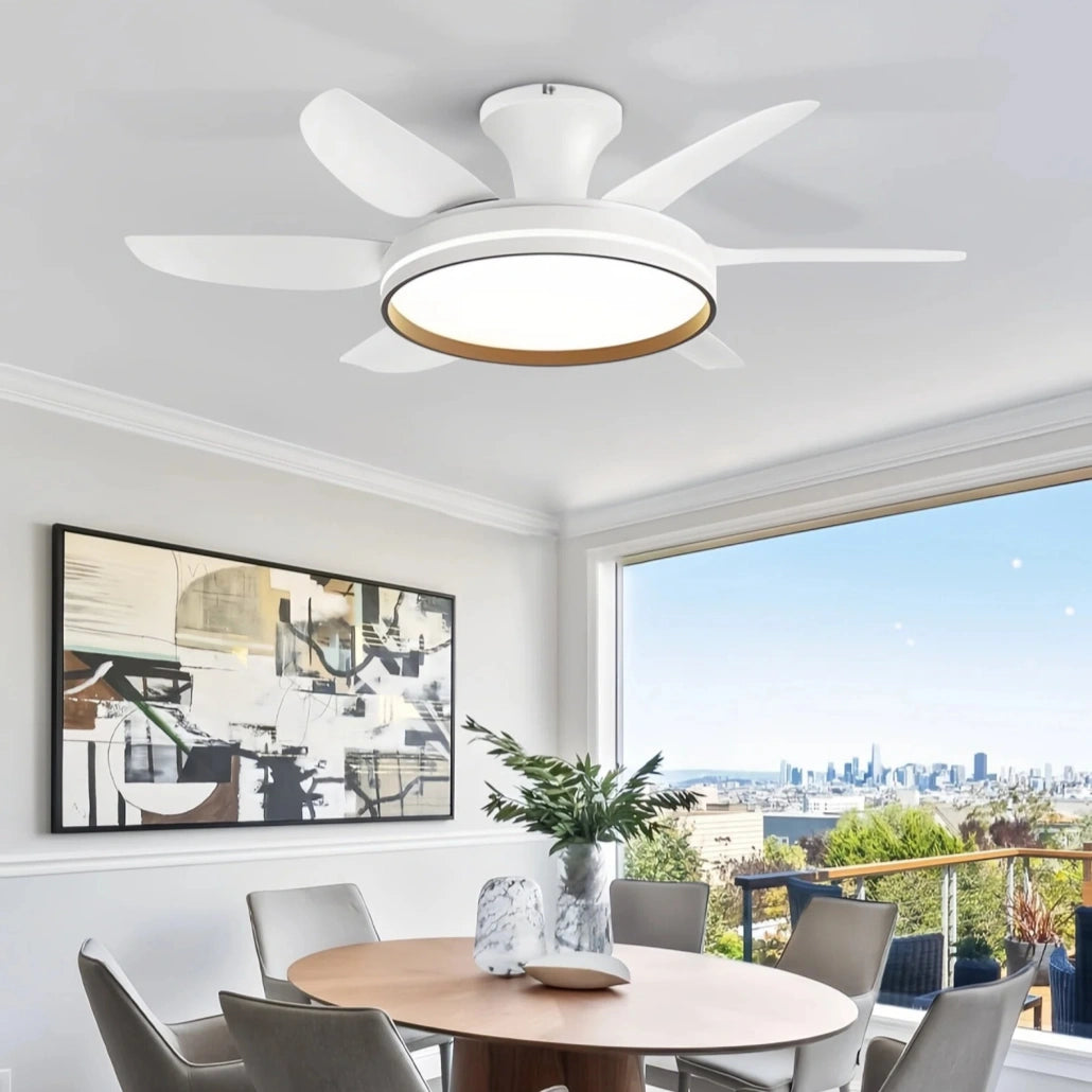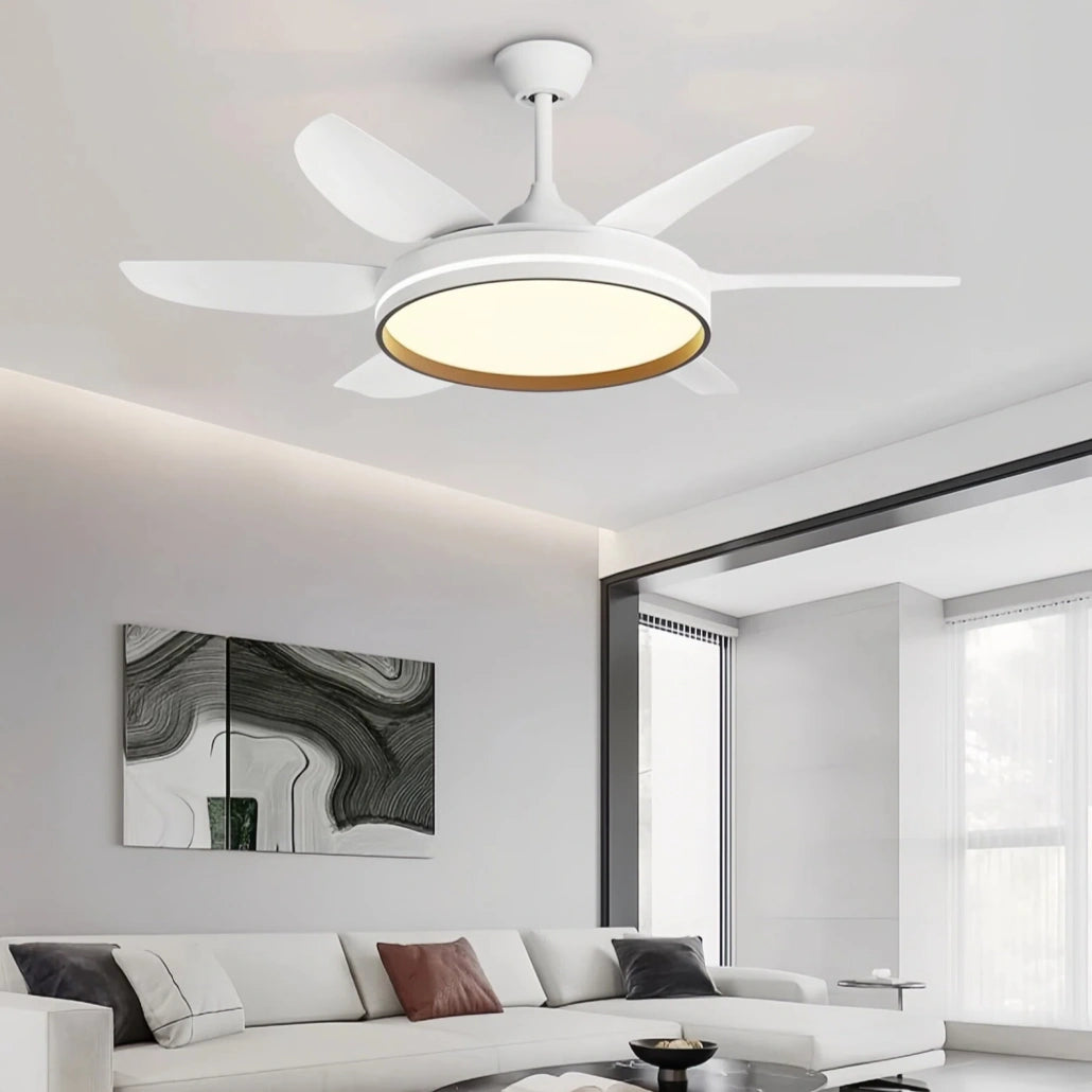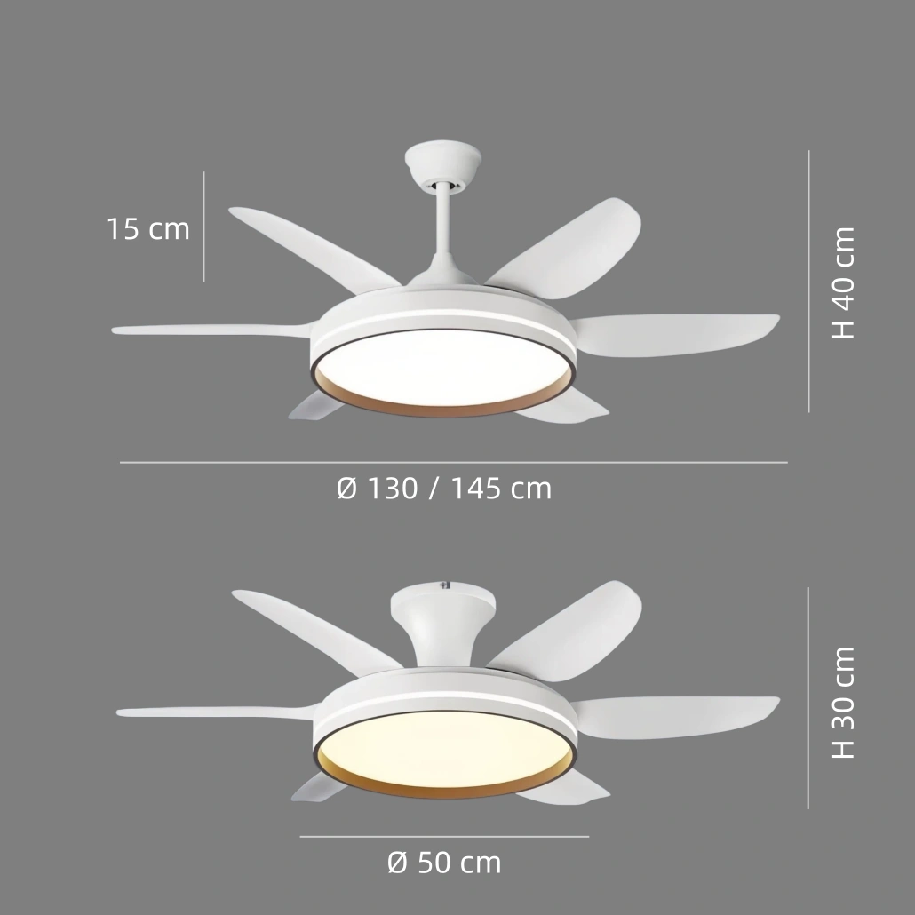 El ventilador de techo blanco con luz combina diseño moderno y tecnología avanzada para un uso confortable. Este ventilador de techo con luz integra iluminación LED de espectro completo con alta reproducción cromática (Ra≥97), tres temperaturas de color regulables y luz sin parpadeo visible, ofreciendo una iluminación uniforme y agradable. Su funcionamiento ultrasilencioso (25–34 dB) lo convierte en un eficiente ventilador de techo silencioso con luz led.
